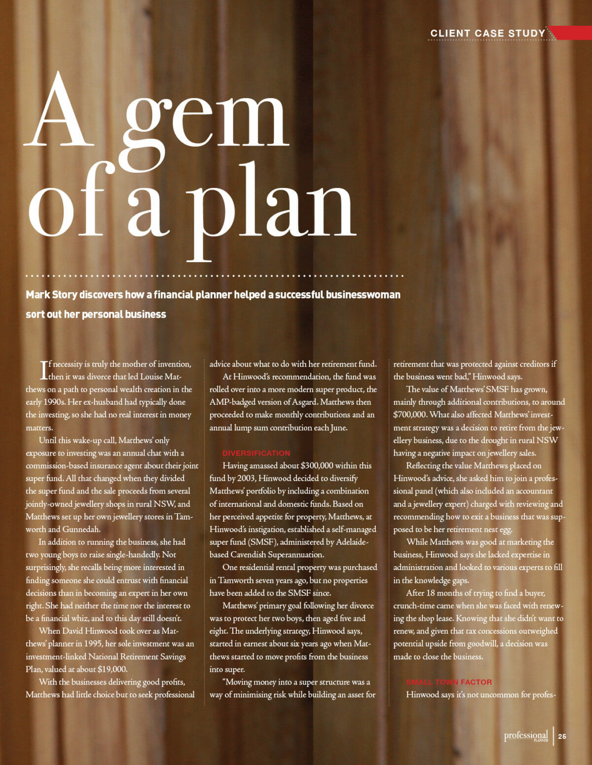 Until this wake-up call, Matthews’ only exposure to investing was an annual chat with a commission-based insurance agent about their joint super fund. All that changed when they divided the super fund and the sale proceeds from several jointly-owned jewellery shops in rural NSW, and Matthews set up her own jewellery stores in Tamworth and Gunnedah.