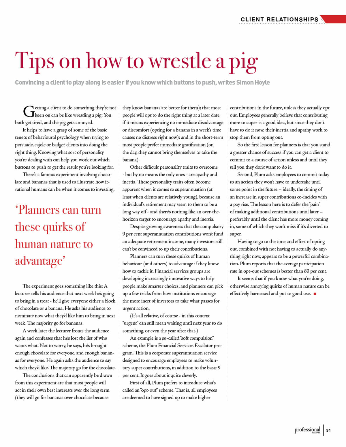 Second, Plum asks employees to commit today to an action they won’t have to undertake until some point in the future – ideally, the timing of an increase in super contributions coincides with a pay rise. The lesson here is to defer the “pain” of making additional contributions until later – preferably until the client has more money coming in, some of which they won’t miss if it’s diverted to super.