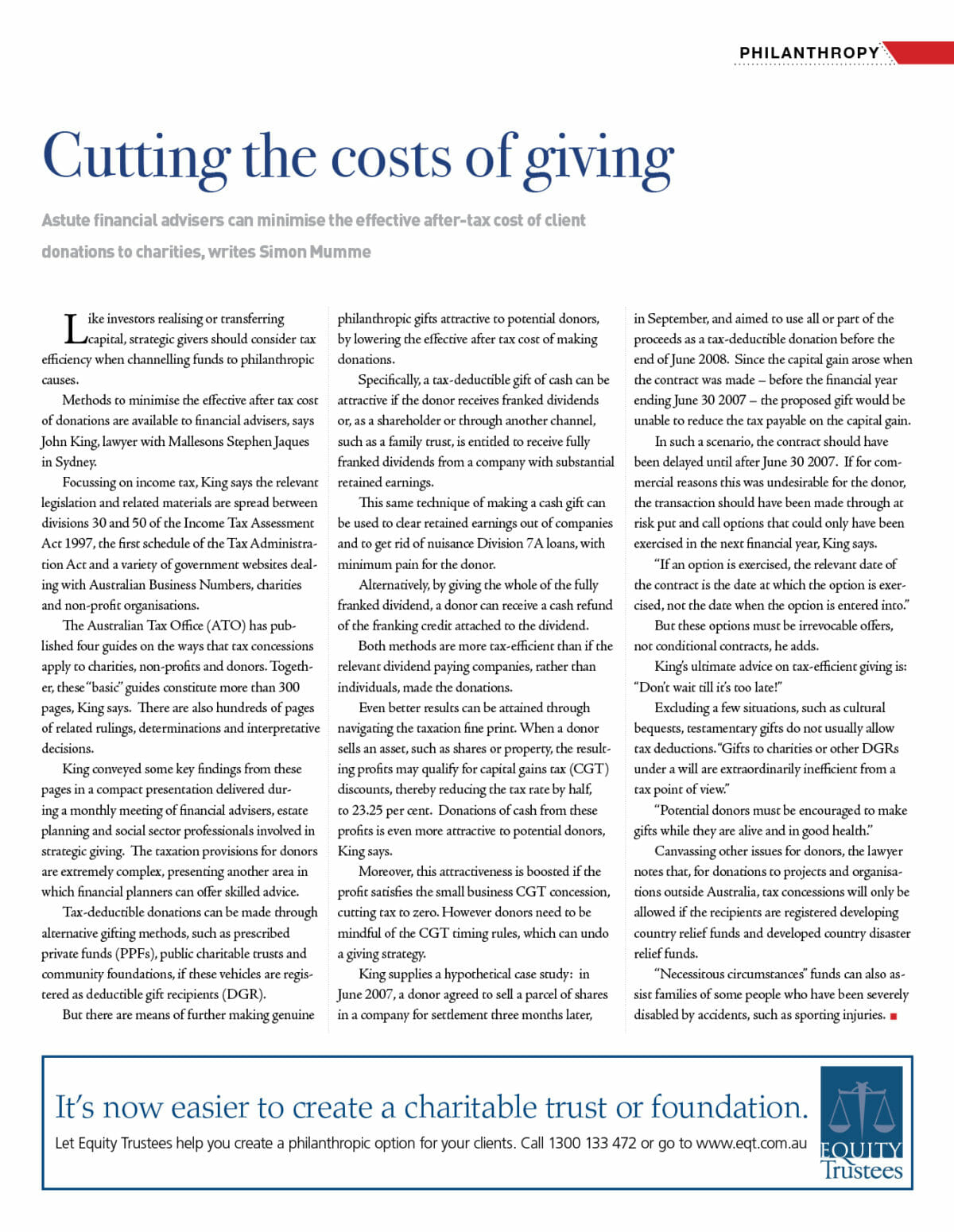 Methods to minimise the effective after tax cost of donations are available to financial advisers, says John King, lawyer with Mallesons Stephen Jaques in Sydney.