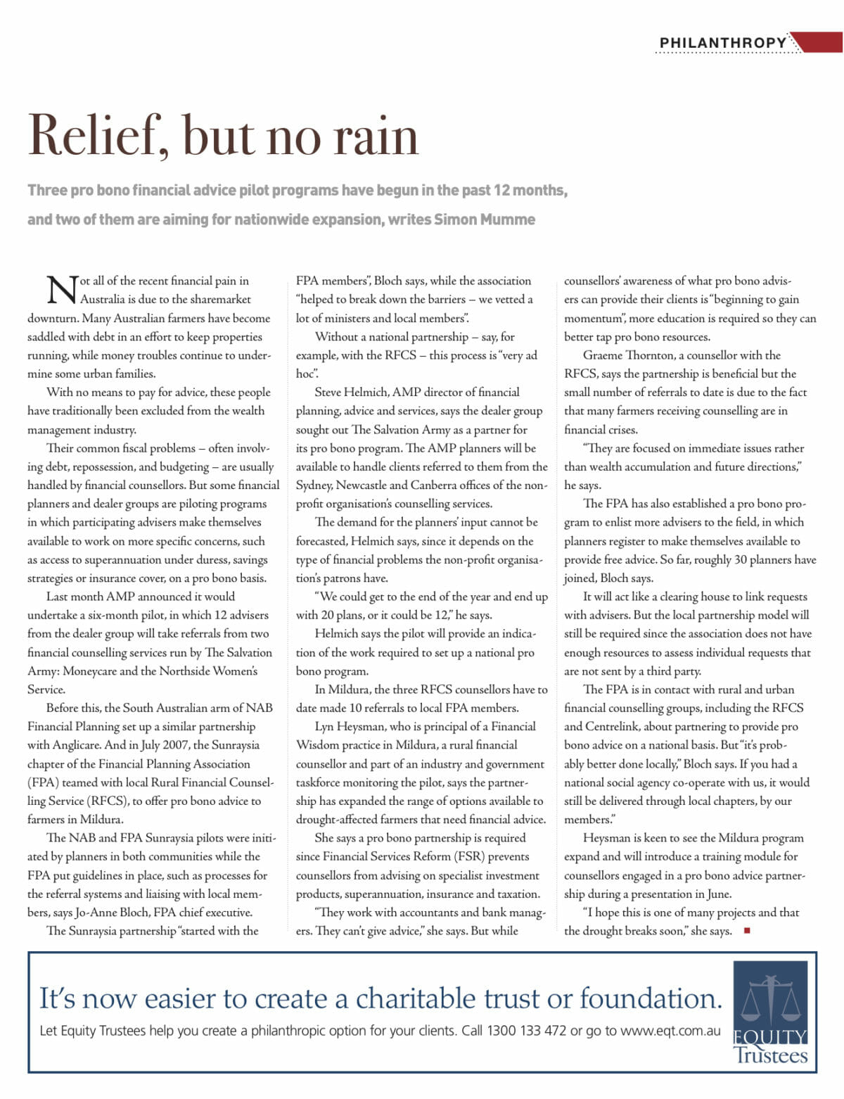Before this, the South Australian arm of NAB Financial Planning set up a similar partnership with Anglicare. And in July 2007, the Sunraysia chapter of the Financial Planning Association (FPA) teamed with local Rural Financial Counselling Service (RFCS), to offer pro bono advice to farmers in Mildura.