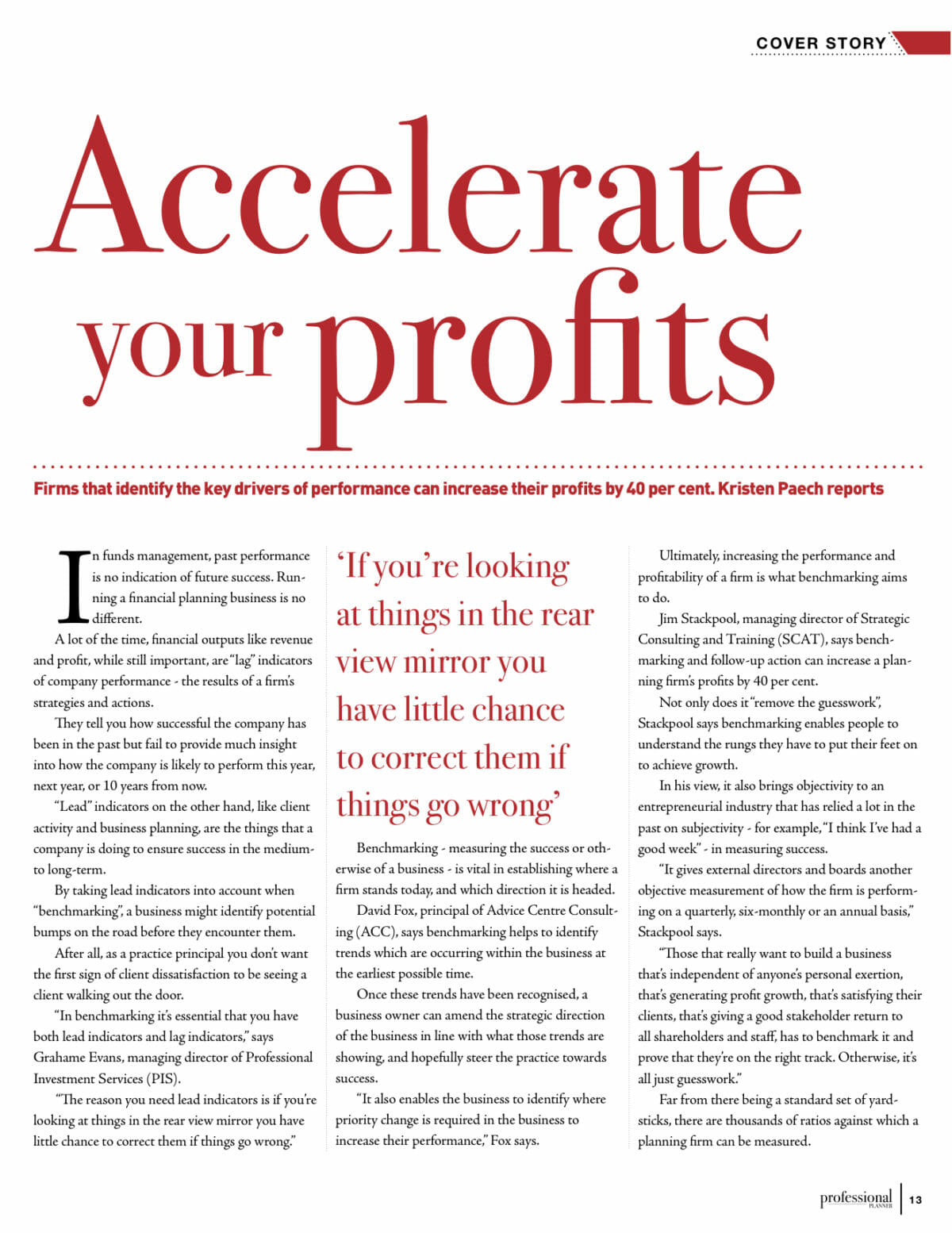 Ultimately, increasing the performance and profitability of a firm is what benchmarking aims to do. Jim Stackpool, managing director of Strategic Consulting and Training (SCAT), says benchmarking and follow-up action can increase a planning firm’s profits by 40 per cent.