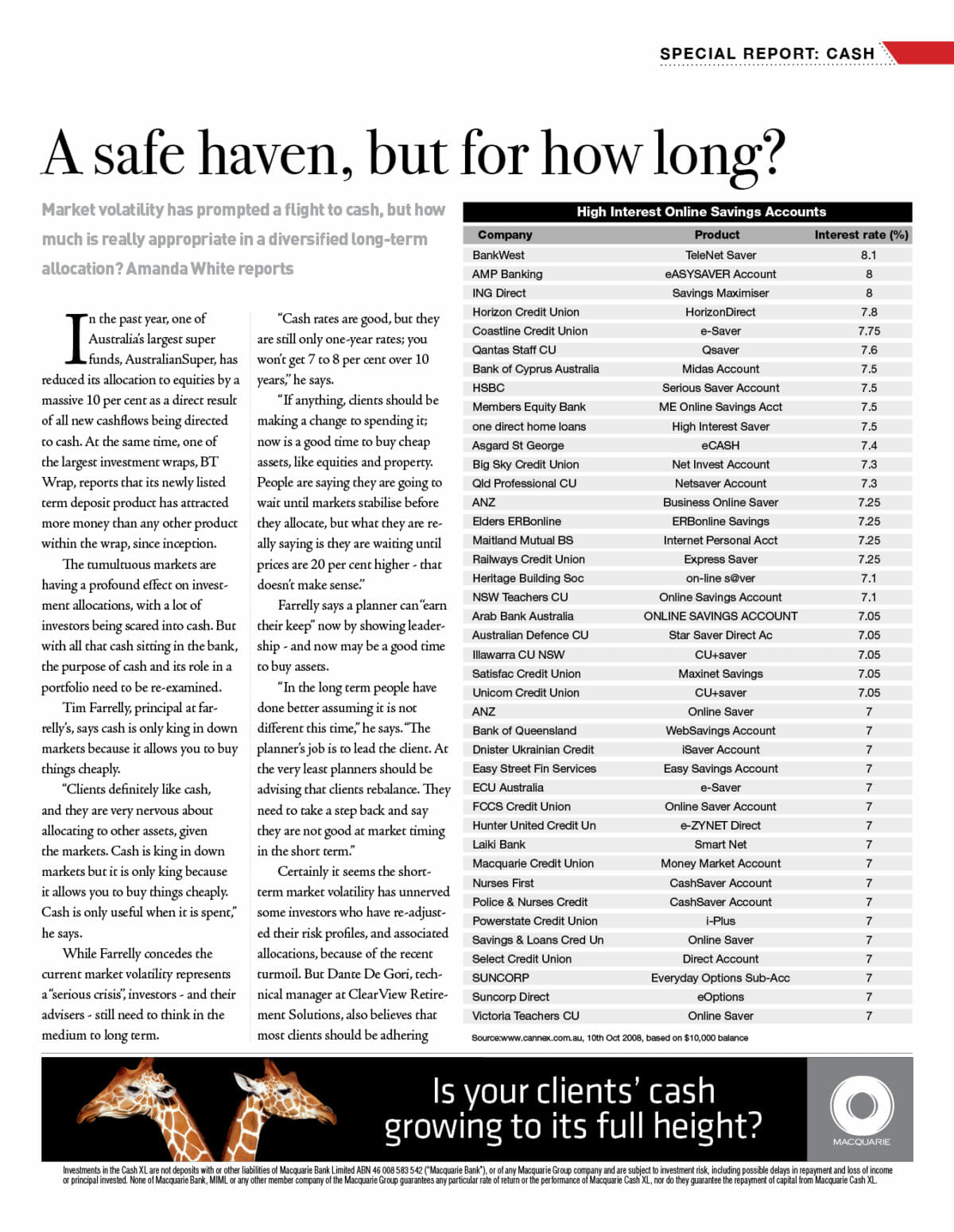 For Macquarie advisers, he says, the most interesting conversations are with those who have come into cash by some life event and who want to know what to do with it. It becomes a question of how to manage the cash exposure.