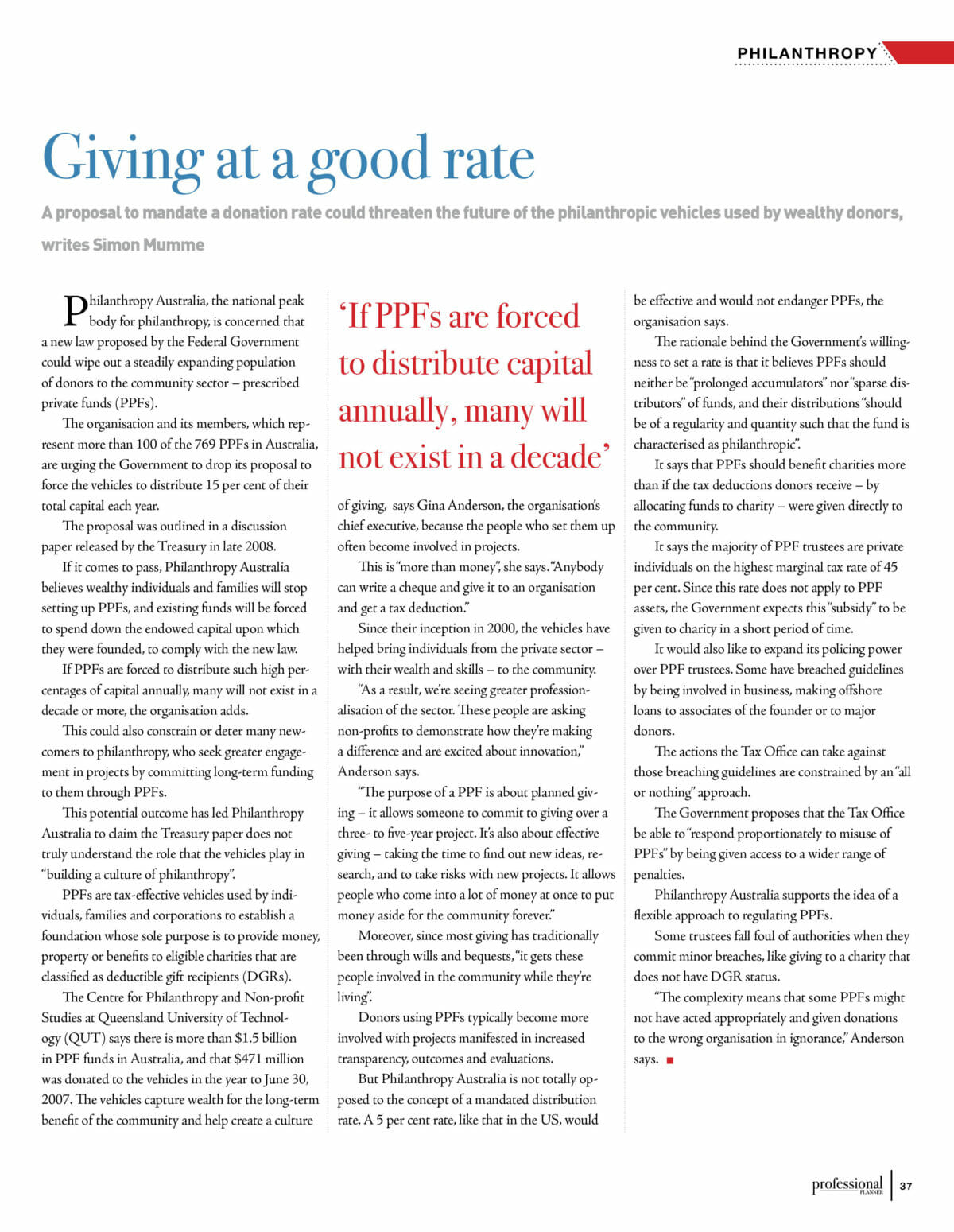 The Centre for Philanthropy and Non-profit Studies at Queensland University of Technol ogy (QUT) says there is more than $1.5 billion in PPF funds in Australia, and that $471 million was donated to the vehicles in the year to June 30, 2007. The vehicles capture wealth for the long-term benefit of the community and help create a culture of giving, says Gina Anderson, the organisation’s chief executive, because the people who set them up often become involved in projects.