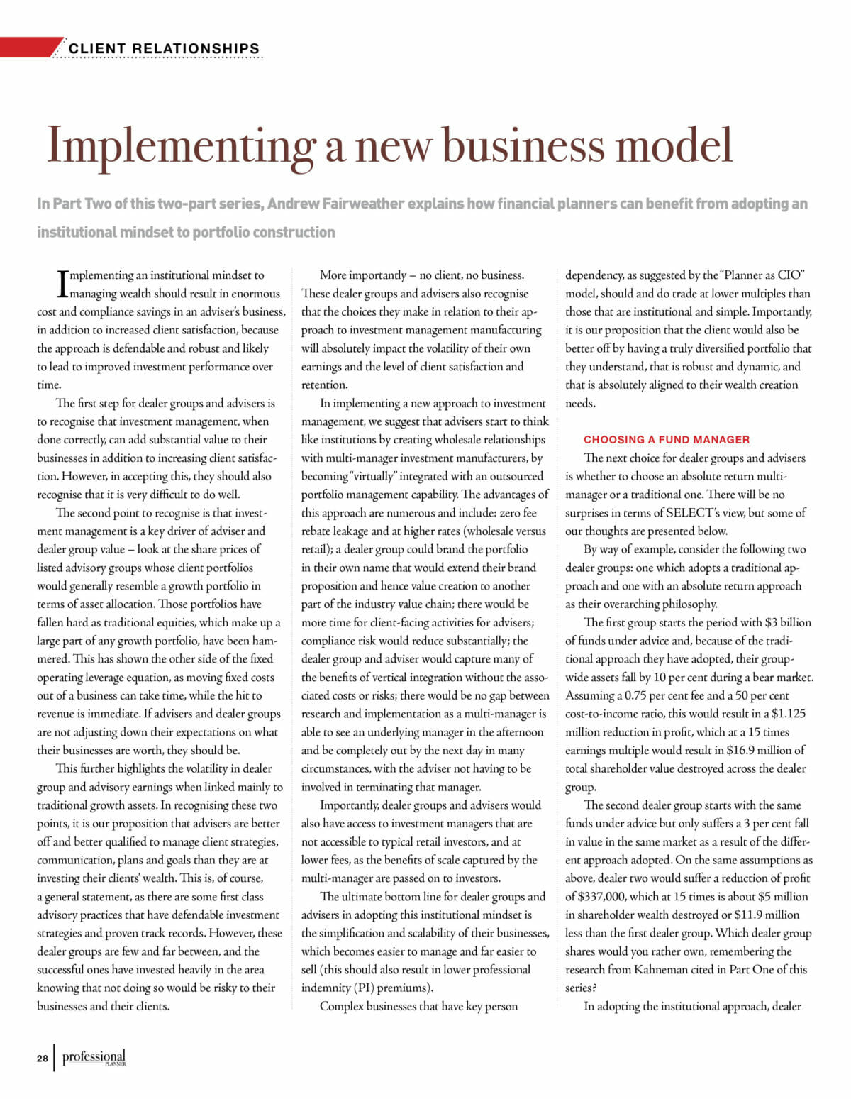 The first step for dealer groups and advisers is to recognise that investment management, when done correctly, can add substantial value to their businesses in addition to increasing client satisfaction. However, in accepting this, they should also recognise that it is very difficult to do well.