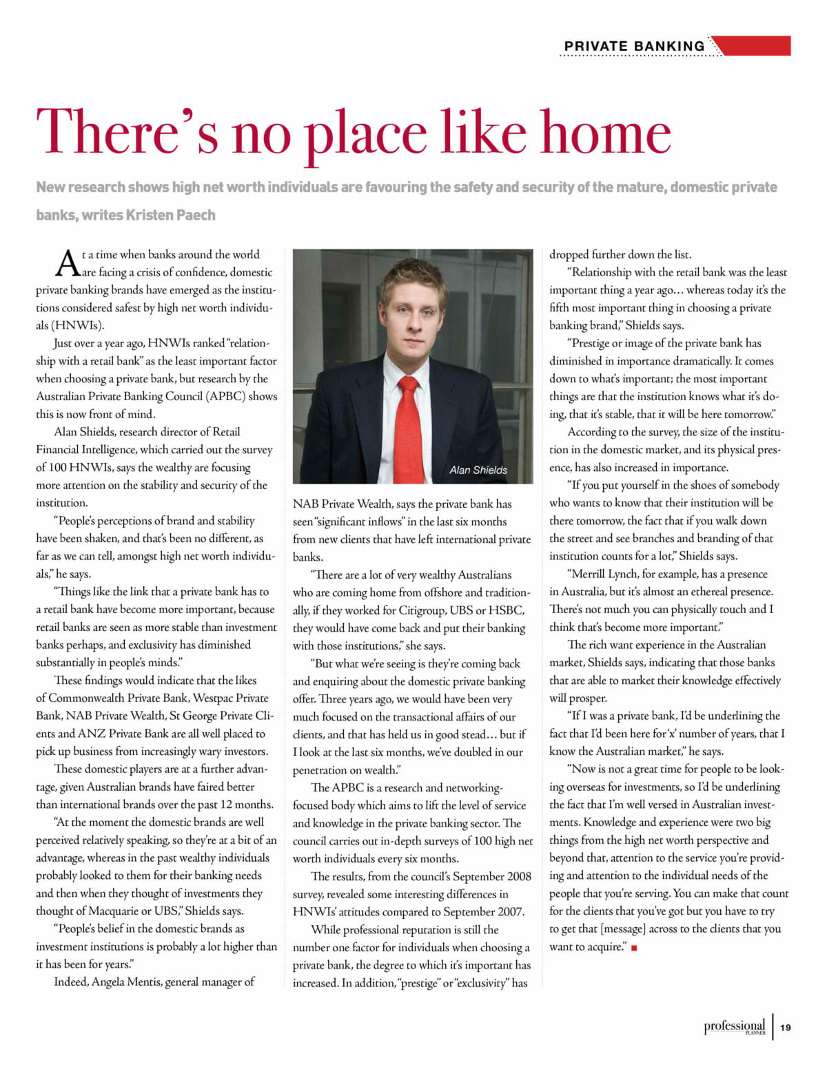 Alan Shields, research director of Retail Financial Intelligence, which carried out the survey of 100 HNWIs, says the wealthy are focusing more attention on the stability and security of the institution.