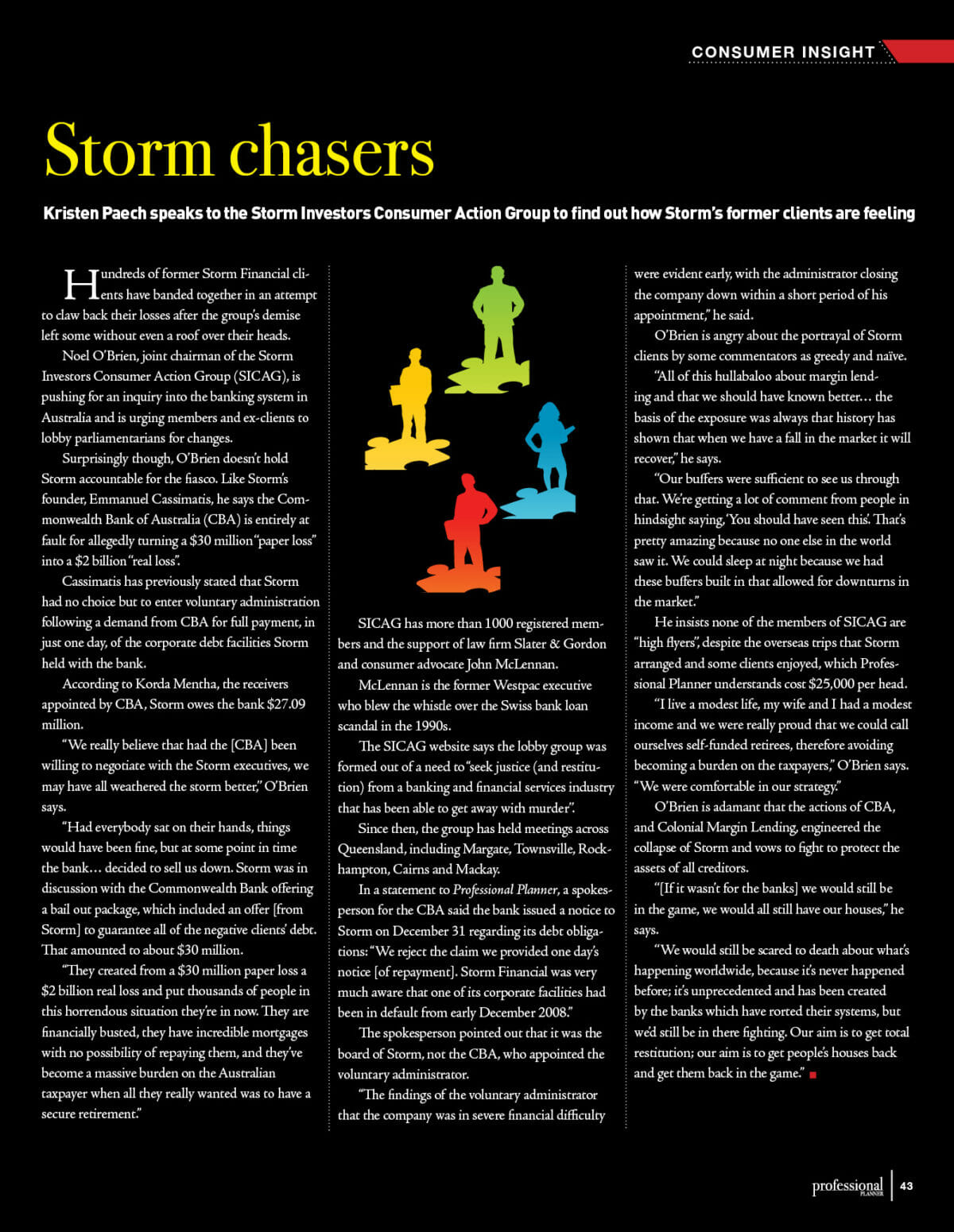 Hundreds of former Storm Financial clients have banded together in an attempt to claw back their losses after the group’s demise left some without even a roof over their heads. Noel O’Brien, joint chairman of the Storm Investors Consumer Action Group (SICAG), is pushing for an inquiry into the banking system in Australia and is urging members and ex-clients to lobby parliamentarians for changes.
