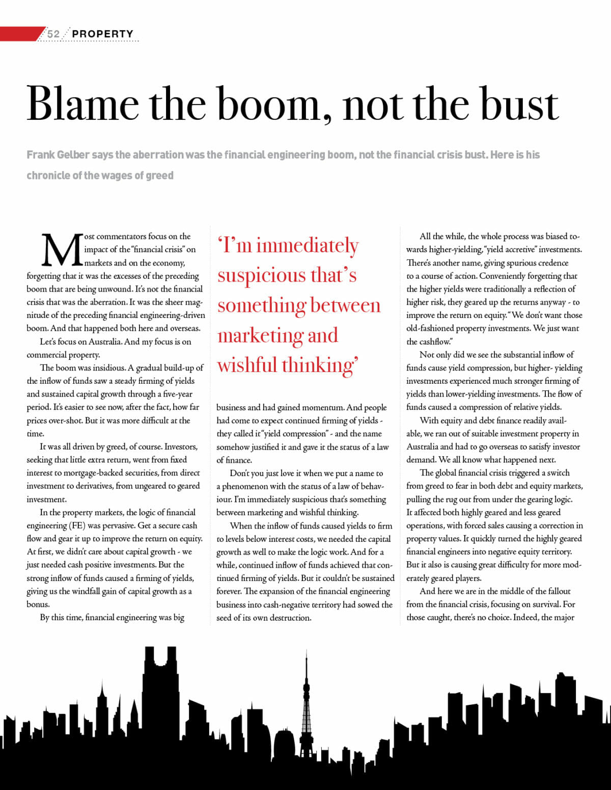 It was all driven by greed, of course. Investors, seeking that little extra return, went from fixed interest to mortgage-backed securities, from direct investment to derivatives, from ungeared to geared investment. In the property markets, the logic of financial engineering (FE) was pervasive. Get a secure cash flow and gear it up to improve the return on equity. At first, we didn’t care about capital growth – we just needed cash positive investments. But the strong inflow of funds caused a firming of yields, giving us the windfall gain of capital growth as a bonus. By this time, financial engineering was big business and had gained momentum. And people had come to expect continued firming of yields – they called it “yield compression” – and the name somehow justified it and gave it the status of a law of finance. Don’t you just love it when we put a name to a phenomenon with the status of a law of behaviour. I’m immediately suspicious that’s something between marketing and wishful thinking.