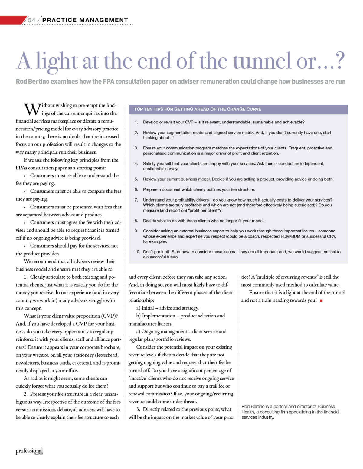 1. Clearly articulate to both existing and po­tential clients, just what it is exactly you do for the money you receive. In our experience (and in every country we work in) many advisers struggle with this concept. What is your client value proposition (CVP)? And, if you have developed a CVP for your busi­ness, do you take every opportunity to regularly reinforce it with your clients, staff and alliance part­ners? Ensure it appears in your corporate brochure, on your website, on all your stationery (letterhead, newsletters, business cards, et cetera), and is promi­nently displayed in your office.  As sad as it might seem, some clients can quickly forget what you actually do for them!