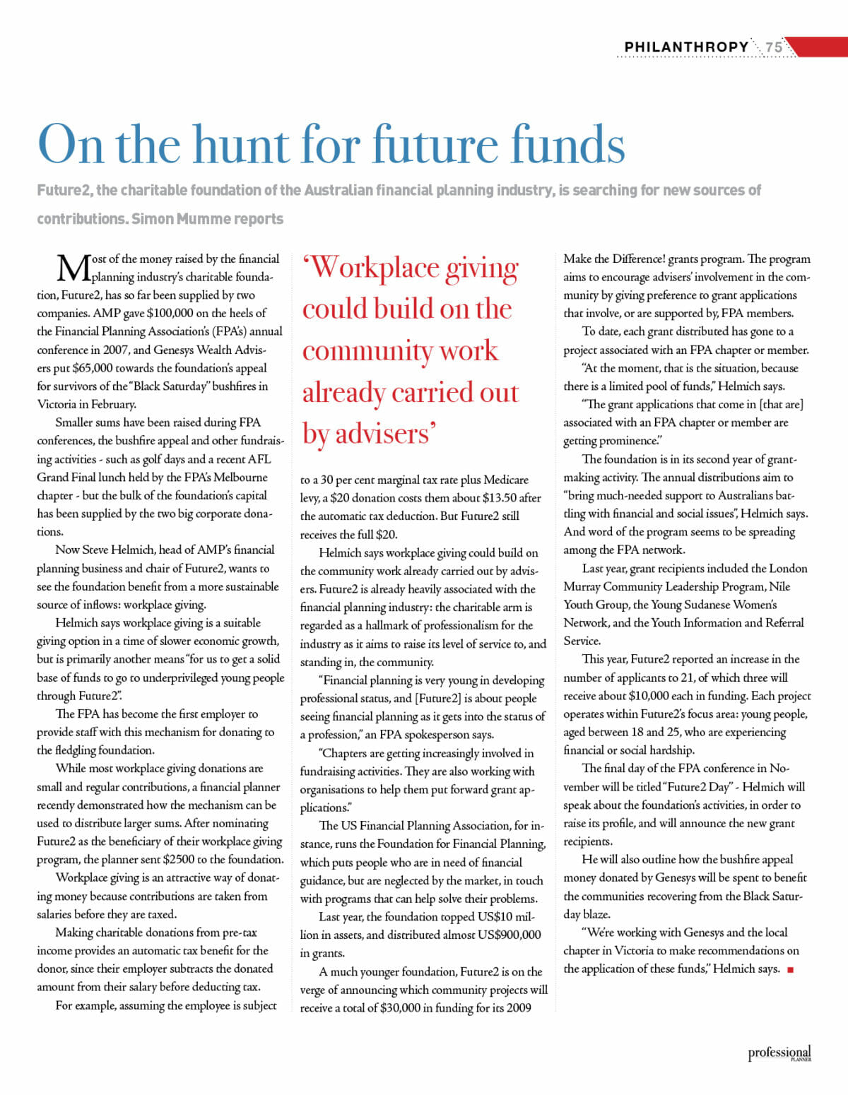 The FPA has become the first employer to provide staff with this mechanism for donating to the fledgling foundation. While most workplace giving donations are small and regular contributions, a financial planner recently demonstrated how the mechanism can be used to distribute larger sums. After nominating Future2 as the beneficiary of their workplace giving program, the planner sent $2500 to the foundation. Workplace giving is an attractive way of donating money because contributions are taken from salaries before they are taxed.