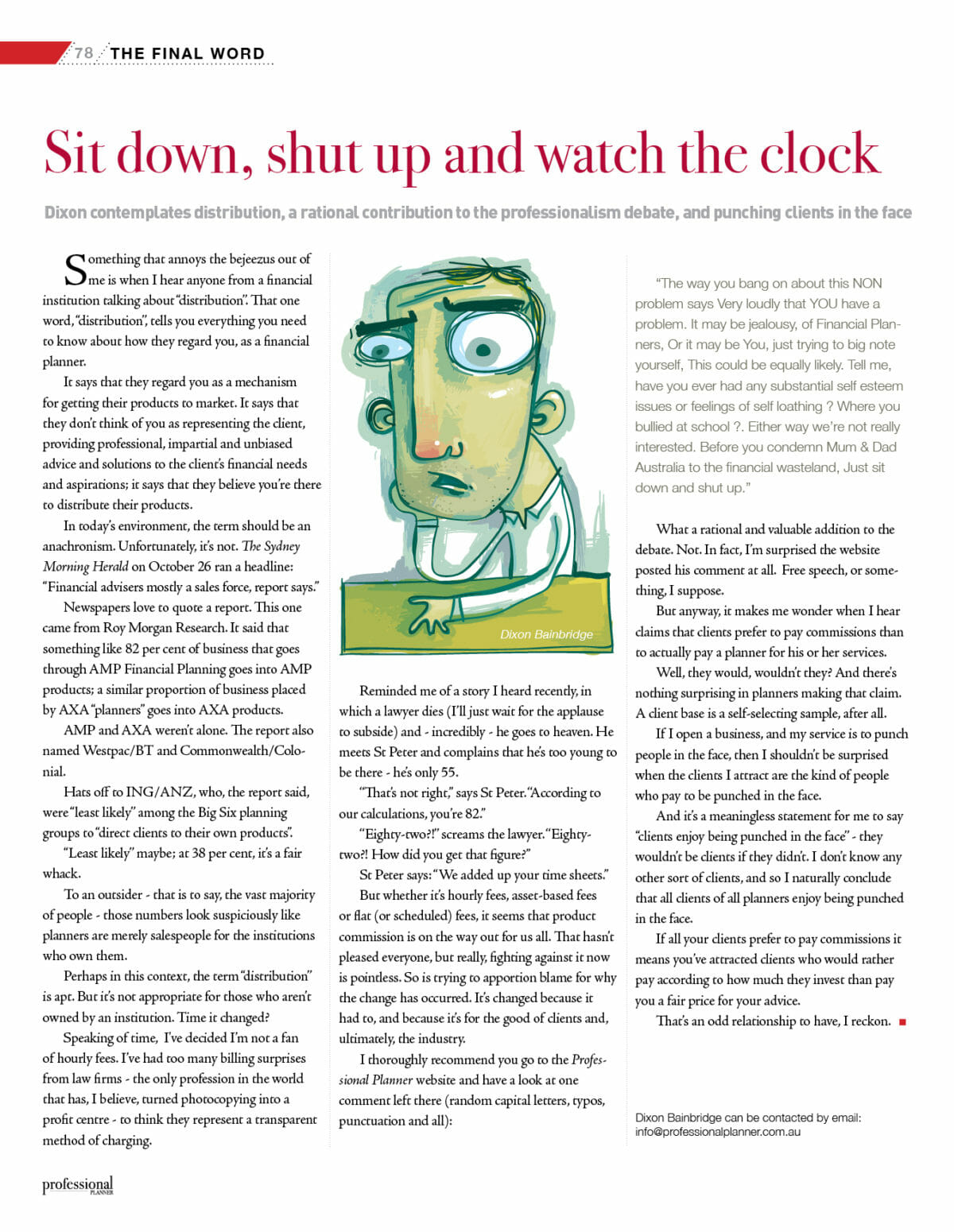 Perhaps in this context, the term “distribution” is apt. But it’s not appropriate for those who aren’t owned by an institution. Time it changed? Speaking of time, I’ve decided I’m not a fan of hourly fees. I’ve had too many billing surprises from law firms – the only profession in the world that has, I believe, turned photocopying into a profit centre – to think they represent a transparent method of charging. Reminded me of a story I heard recently, in which a lawyer dies (I’ll just wait for the applause to subside) and – incredibly – he goes to heaven. He meets St Peter and complains that he’s too young to be there – he’s only 55. “That’s not right,” says St Peter. “According to our calculations, you’re 82.” “Eighty-two?!” screams the lawyer. “Eightytwo?! How did you get that figure?” St Peter says: “We added up your time sheets.” But whether it’s hourly fees, asset-based fees or flat (or scheduled) fees, it seems that product commission is on the way out for us all.