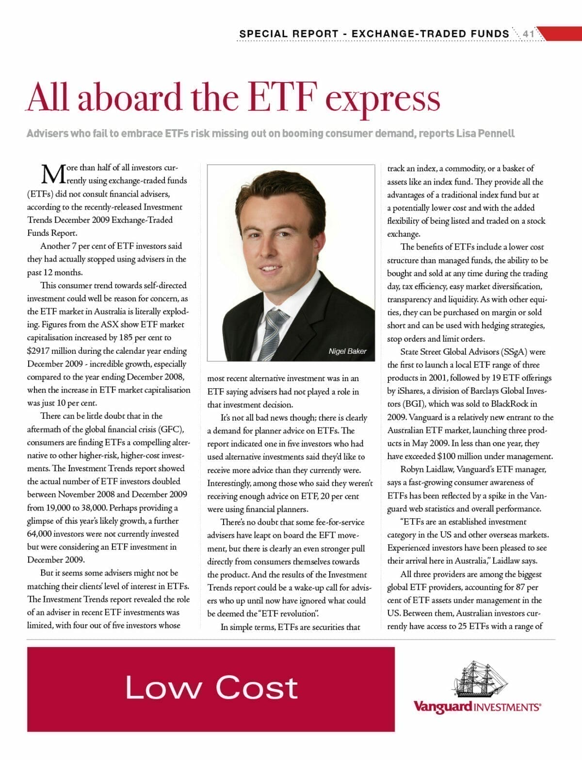 Robyn Laidlaw, Vanguard’s ETF manager, says a fast-growing consumer awareness of ETFs has been reflected by a spike in the Vanguard web statistics and overall performance.