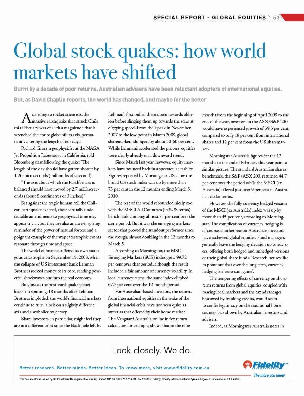 Set against the tragic human toll the Chil­ean earthquake exacted, these virtually unde­tectable amendments to geophysical time may appear trivial, but they are also an awe-inspiring reminder of the power of natural forces; and a poignant example of the way catastrophic events resonate through time and space.  The world of finance suffered its own analo­gous catastrophe on September 15, 2008, when the collapse of US investment bank Lehman Brothers rocked money to its core, sending pow­erful shockwaves out into the real economy.  But, just as the post-earthquake planet keeps on spinning, 18 months after Lehman Brothers imploded, the world’s financial markets continue to turn, albeit on a slightly different axis and a wobblier trajectory.  Share investors, in particular, might feel they are in a different orbit since the black hole left by Lehman’s first pulled them down towards obliv­ion before slinging them up towards the stars at dizzying speed. From their peak in November 2007 to the low point in March 2009, global sharemarkets slumped by about 50-60 per cent.