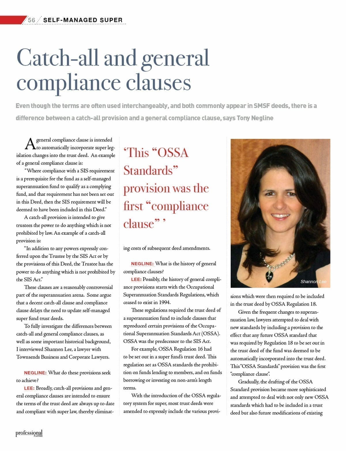 LEE : Possibly, the history of general compliance provisions starts with the Occupational Superannuation Standards Regulations, which ceased to exist in 1994. These regulations required the trust deed of a superannuation fund to include clauses that reproduced certain provisions of the Occupational Superannuation Standards Act (OSSA). OSSA was the predecessor to the SIS Act. For example, OSSA Regulation 16 had to be set out in a super fund’s trust deed. This regulation set as OSSA standards the prohibition on funds lending to members, and on funds borrowing or investing on non-arm’s length terms. With the introduction of the OSSA regulatory system for super, most trust deeds were amended to expressly include the various provisions which were then required to be included in the trust deed by OSSA Regulation 18. Given the frequent changes to superannuation law, lawyers attempted to deal with new standards by including a provision to the effect that any future OSSA standard that was required by Regulation 18 to be set out in the trust deed of the fund was deemed to be automatically incorporated into the trust deed. This “OSSA Standards” provision was the first “compliance clause”. Gradually, the drafting of the OSSA Standard provision became more sophisticated and attempted to deal with not only new OSSA standards which had to be included in a trust deed but also future modifications of existing OSSA standards and future new standards. At the same time, catch-all provisions became a popular means of conferring power on trustees to deal with any new developments in legislation and practice.