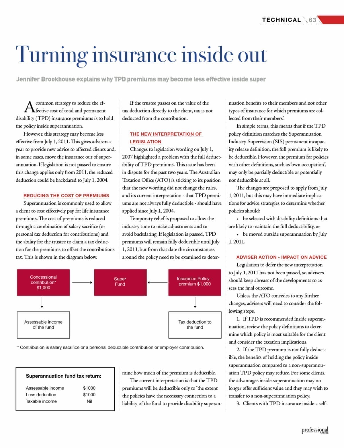 The current interpretation is that the TPD premiums will be deductible only to “the extent the policies have the necessary connection to a liability of the fund to provide disability superannuation benefits to their members and not other types of insurance for which premiums are collected from their members”. In simple terms, this means that if the TPD policy definition matches the Superannuation Industry Supervision (SIS) permanent incapacity release definition, the full premium is likely to be deductible. However, the premium for policies with other definitions, such as “own occupation”, may only be partially deductible or potentially not deductible at all. The changes are proposed to apply from July 1, 2011, but this may have immediate implications for advice strategies to determine whether policies should: