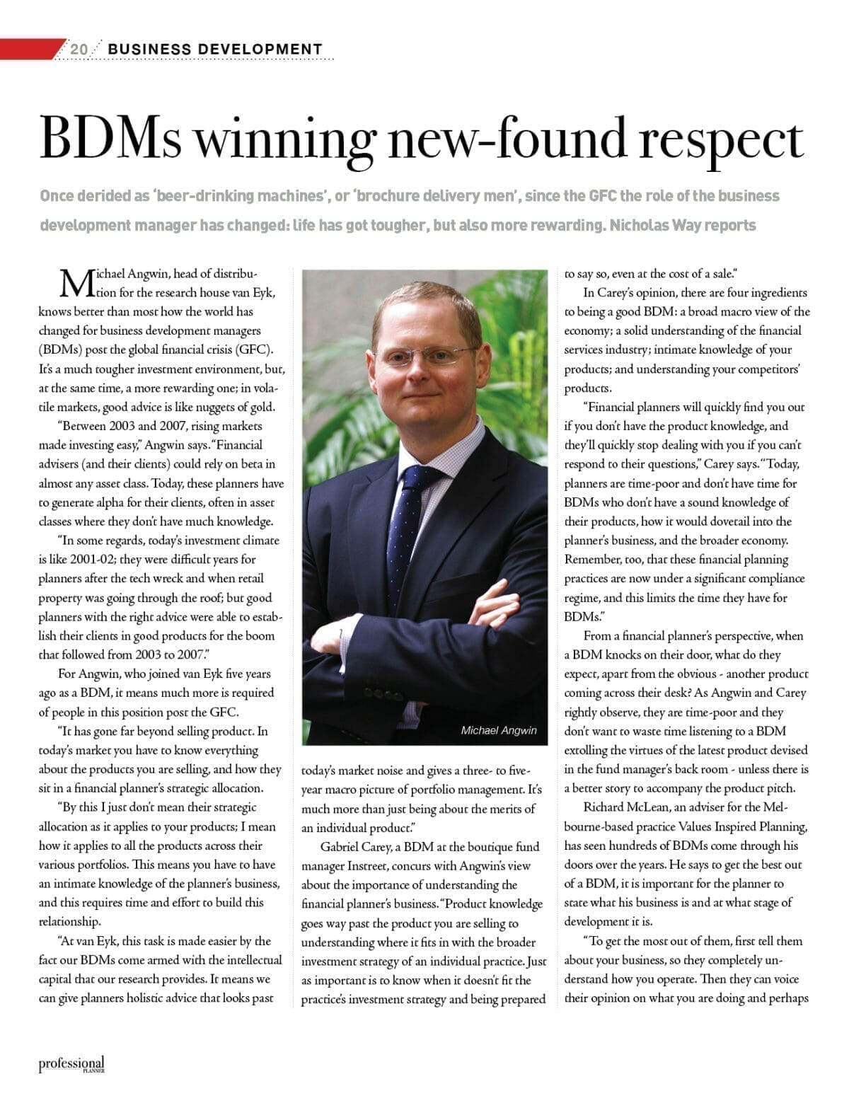 Michael Angwin, head of distribution for the research house van Eyk, knows better than most how the world has changed for business development managers (BDMs) post the global financial crisis (GFC). It’s a much tougher investment environment, but, at the same time, a more rewarding one; in volatile markets, good advice is like nuggets of gold.