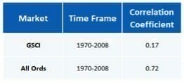 The table below shows that over 38 years, BHP has a 0.72 correlation to the All Ordinaries Accumulation Index, ie 72 per cent of BHP’s returns are related to movements in the Australian stock market, whilst only 17 per cent of the returns are related to movements in the Goldman Sachs Commodities Index, an index of 24 commodities markets.
