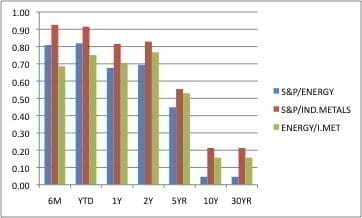 Let’s start by looking at the question we raised above ie why BHP is so correlated to movements in stock markets. One reason is that over time, the resources which BHP has the greatest exposure to – base metals (copper, iron ore, aluminium etc) and energy markets (crude oil) have themselves become more correlated to movements in stocks. The chart below shows the correlation between the base metals and energy indices relative to the S&P500 over various time horizons.