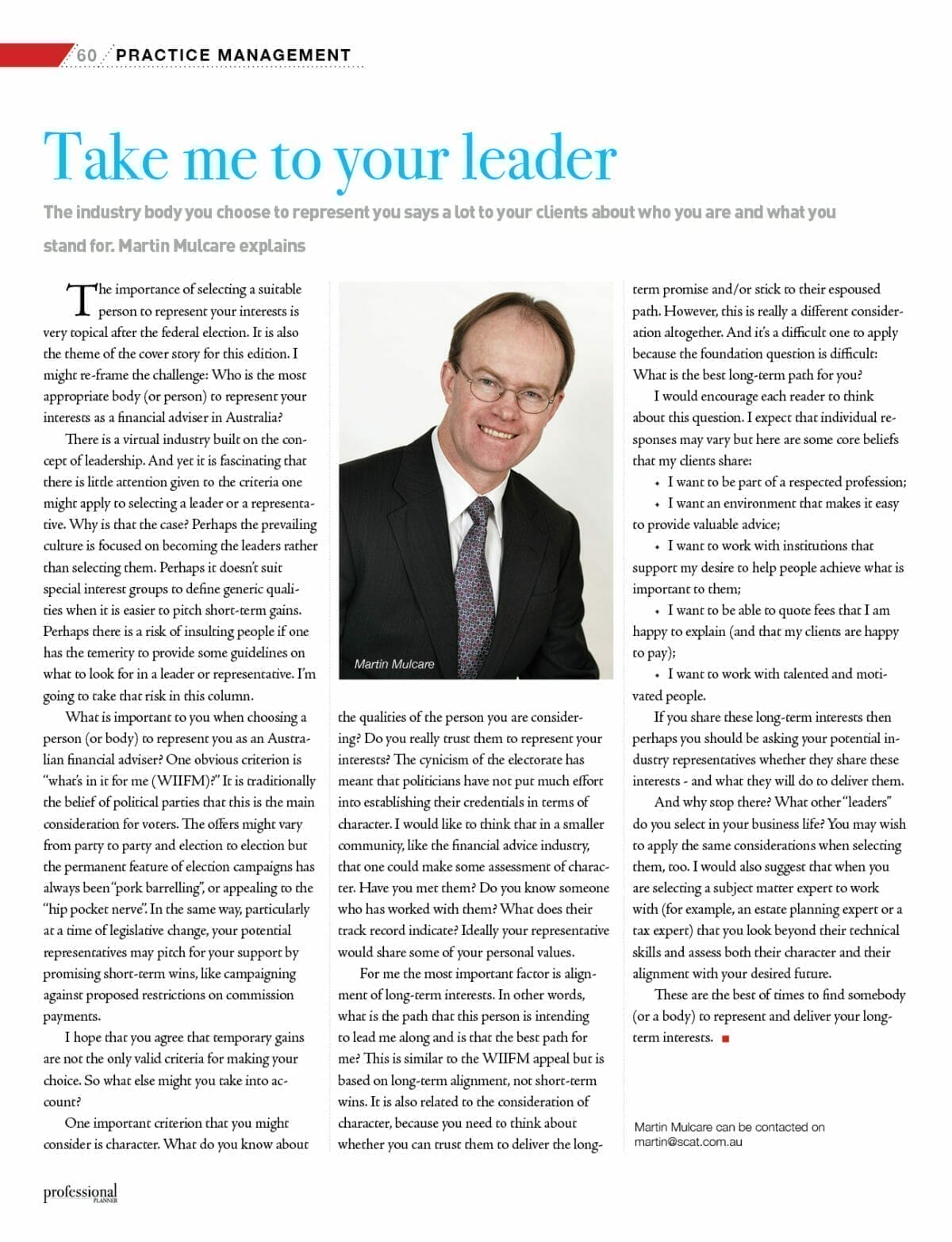 The importance of selecting a suitable person to represent your interests is very topical after the federal election. It is also the theme of the cover story for this edition. I might re-frame the challenge: Who is the most appropriate body (or person) to represent your interests as a financial adviser in Australia?