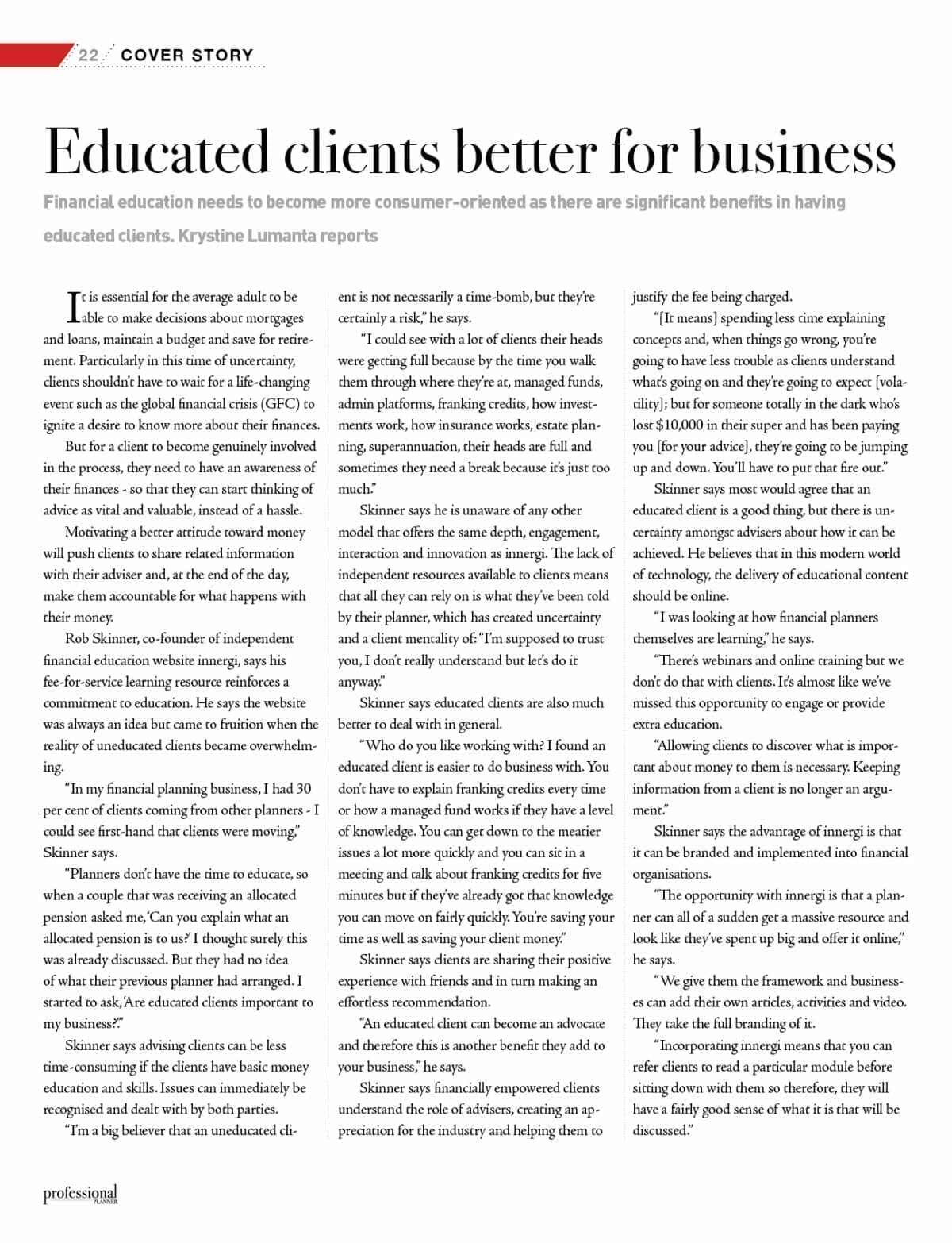 Rob Skinner, co-founder of independent financial education website innergi, says his fee-for-service learning resource reinforces a commitment to education. He says the website was always an idea but came to fruition when the reality of uneducated clients became overwhelming.