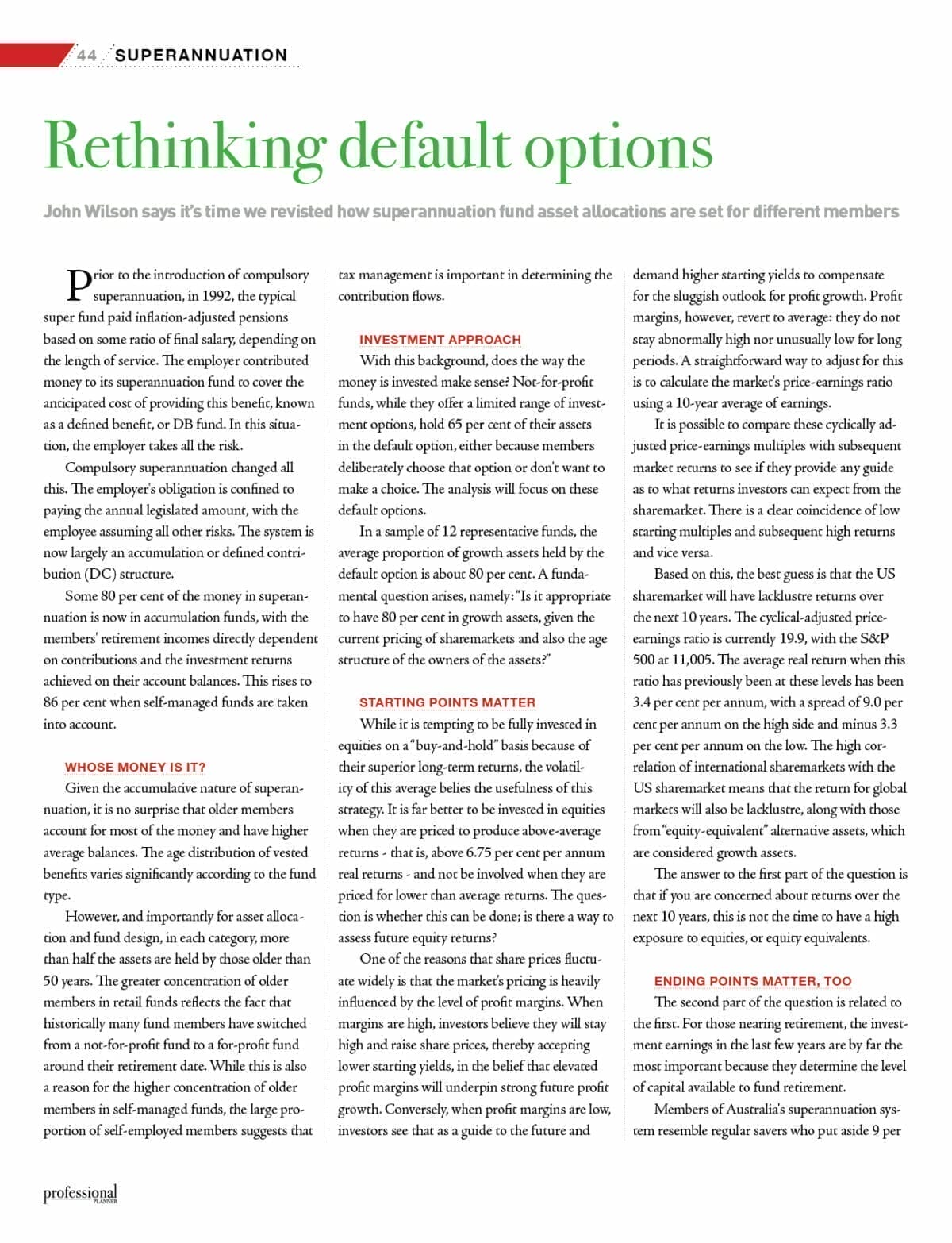 In a sample of 12 representative funds, the average proportion of growth assets held by the default option is about 80 per cent. A fundamental question arises, namely: “Is it appropriate to have 80 per cent in growth assets, given the current pricing of sharemarkets and also the age structure of the owners of the assets?”