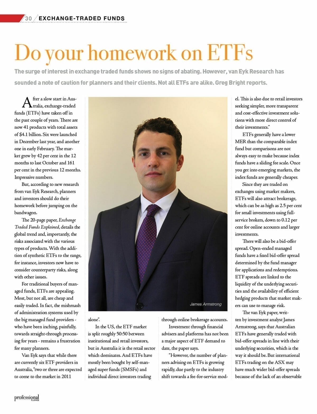 The surge of interest in exchange traded funds shows no signs of abating. However, van Eyk Research has sounded a note of caution for planners and their clients. Not all ETFs are alike. Greg Bright reports.