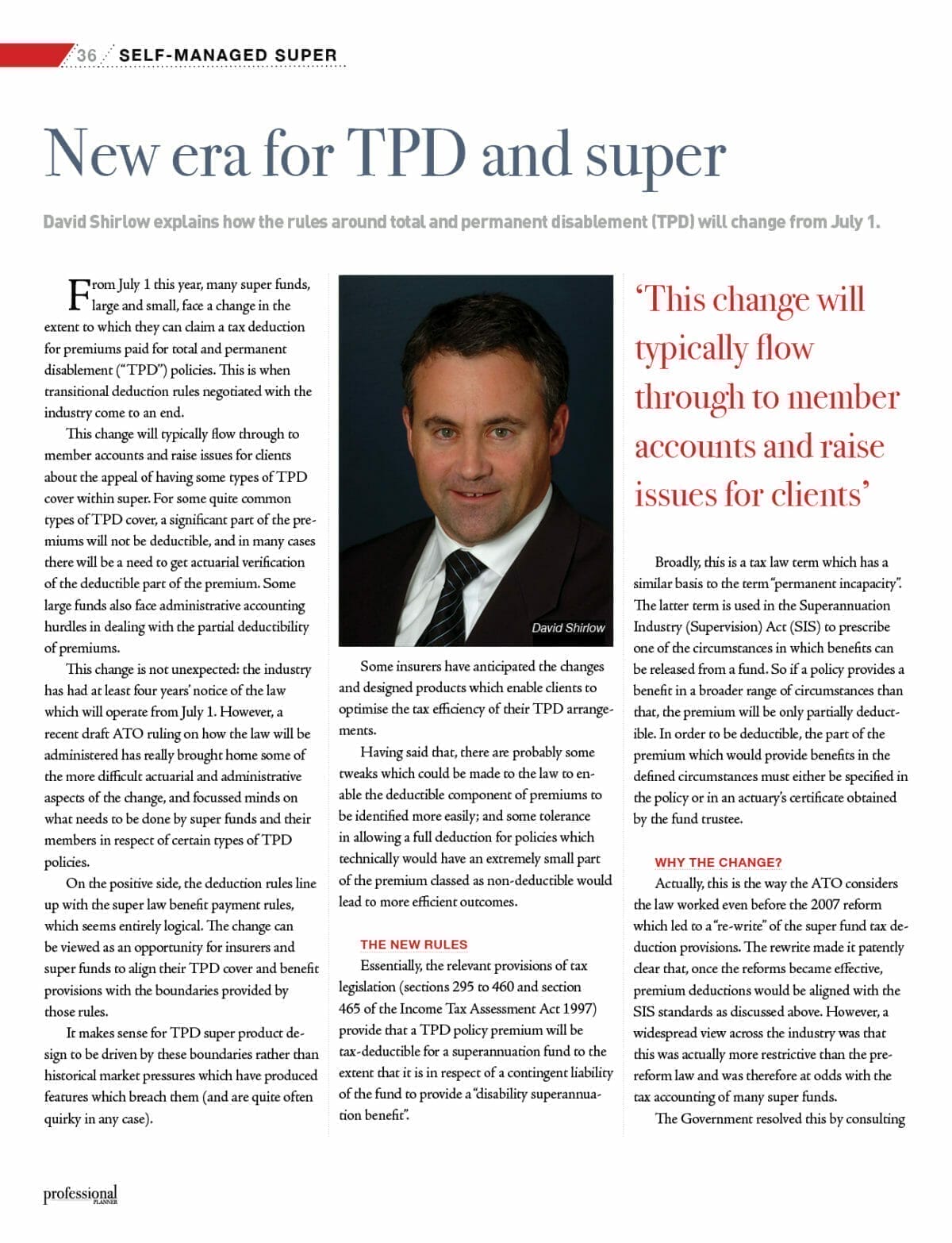 We await the outcome of negotiations and the final ATO general ruling on TPD deductibility for super funds. It could well be that in some cases there will be a frantic scramble to put measures in place to deal will partial deductibility of insurance in the 2011-12 year. However, for many clients, it will remain tax efficient to have permanent incapacity TPD cover, which is immediately releasable if held within super rather than outside it. For these clients and funds generally, the July change may be a catalyst to review their arrangements and optimise the accessibility and deductibility of TPD insurance.
