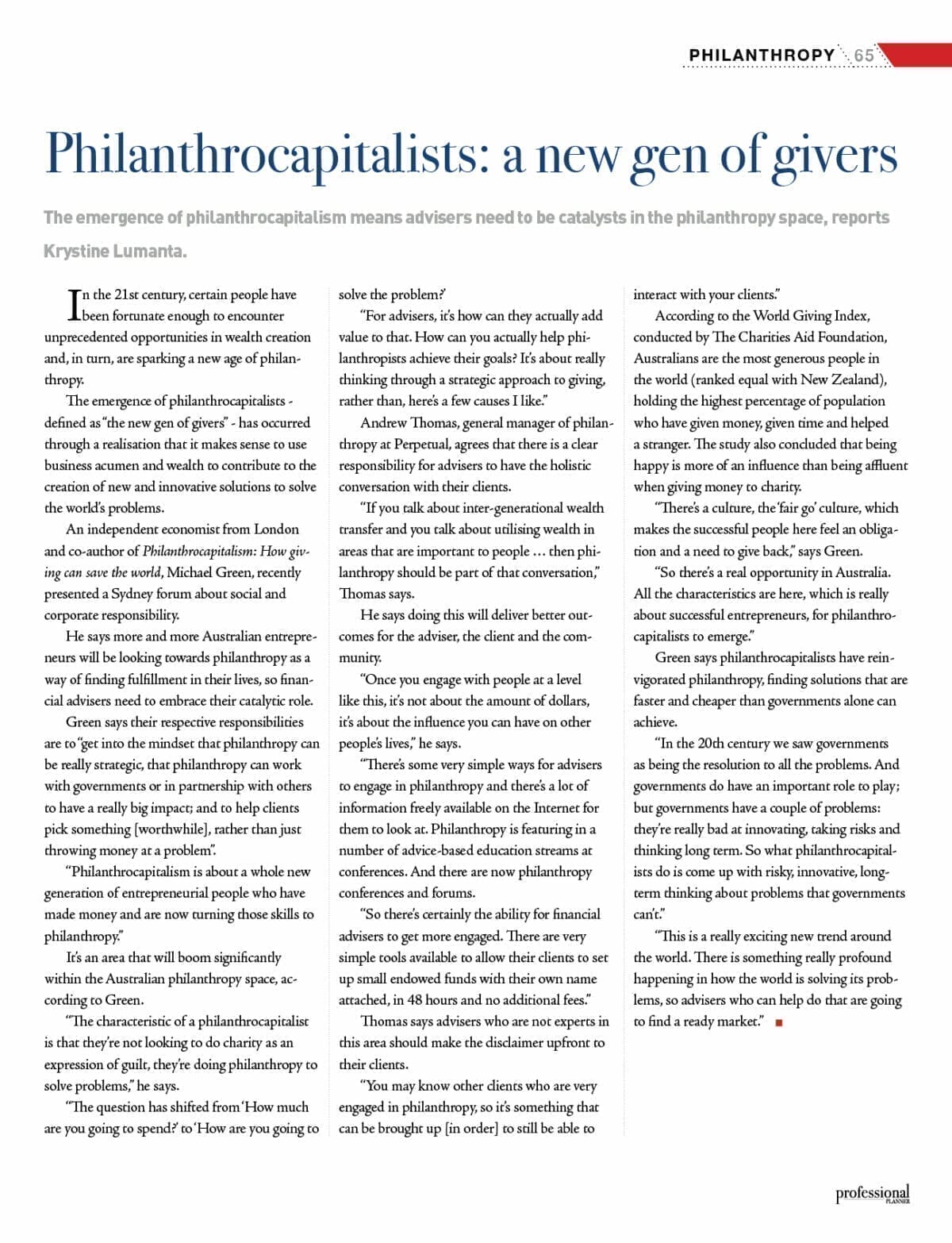 “Philanthrocapitalism is about a whole new generation of entrepreneurial people who have made money and are now turning those skills to philanthropy.”