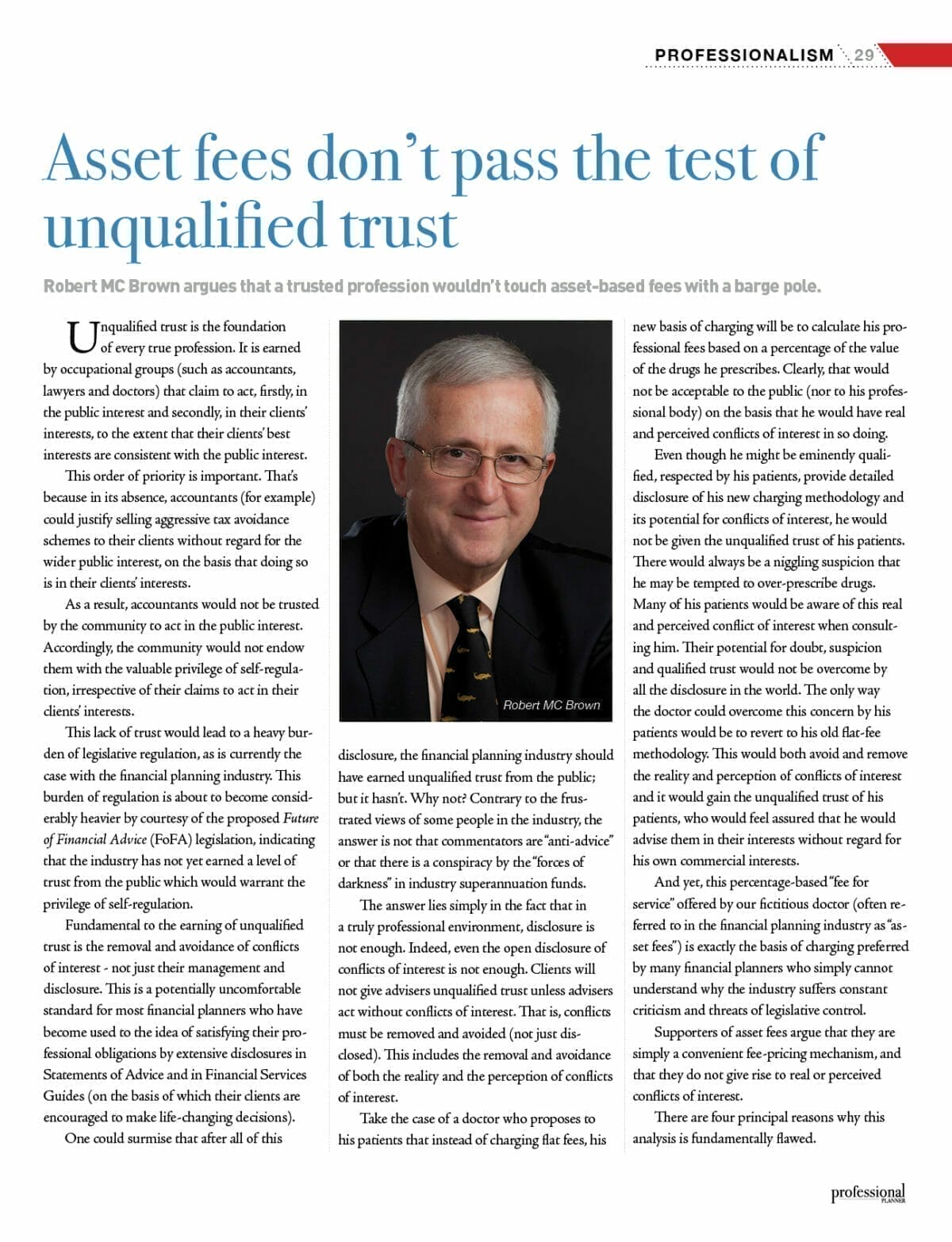 Robert MC Brown argues that a trusted profession wouldn’t touch asset-based fees with a barge pole.