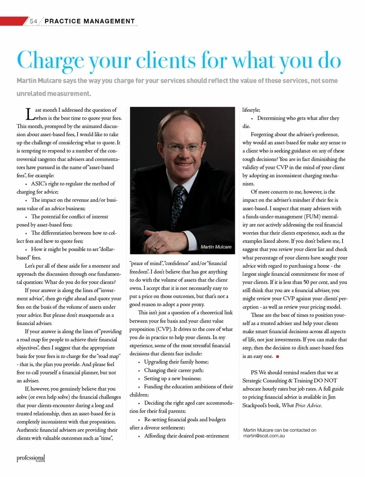 PS We should remind readers that we at Strategic Consulting & Training DO NOT advocate hourly rates but job rates. A full guide to pricing financial advice is available in Jim Stackpool’s book, What Price Advice.