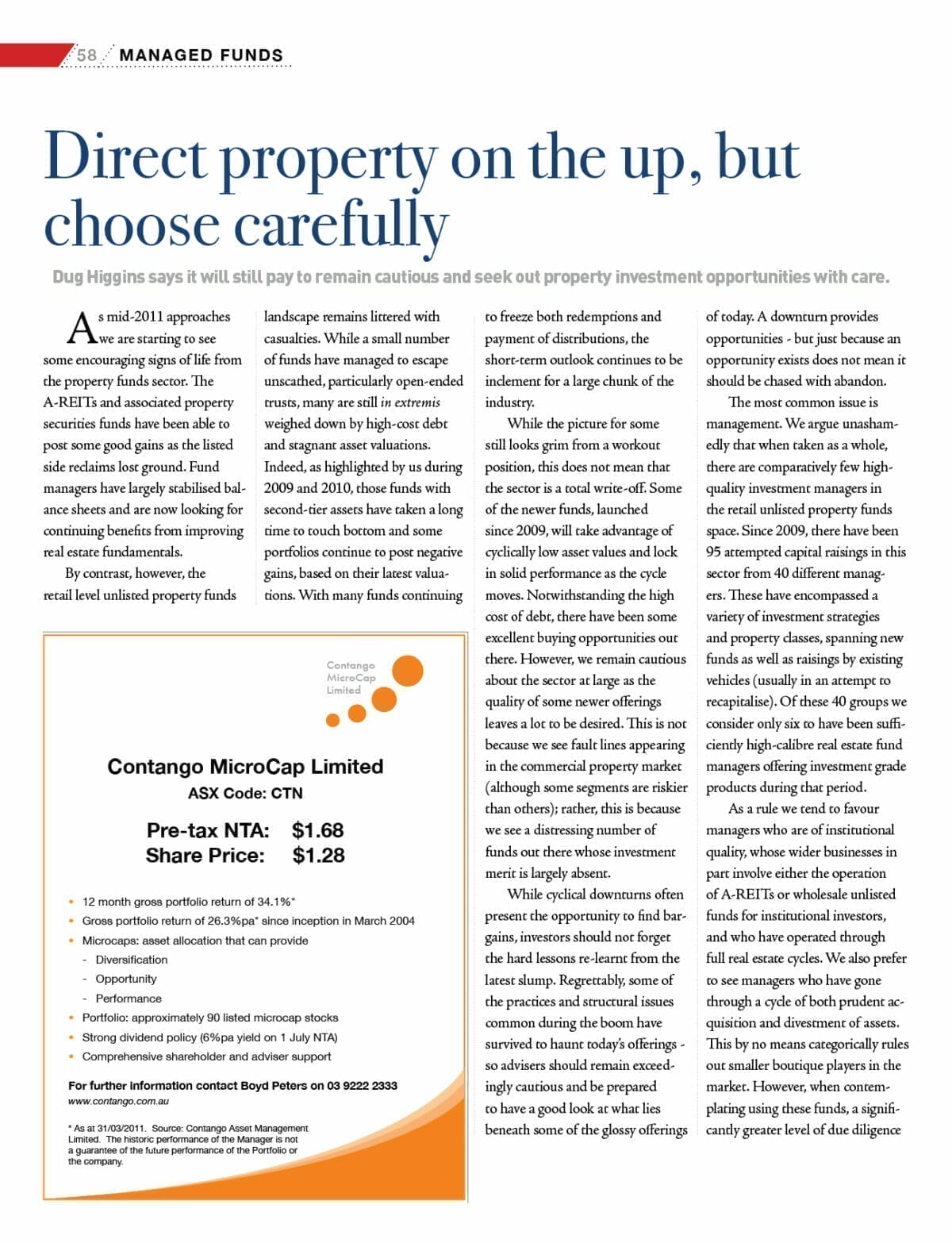 As a rule we tend to favour managers who are of institutional quality, whose wider businesses in part involve either the operation of A-REITs or wholesale unlisted funds for institutional investors, and who have operated through full real estate cycles. We also prefer to see managers who have gone through a cycle of both prudent acquisition and divestment of assets. This by no means categorically rules out smaller boutique players in the market. However, when contemplating using these funds, a significantly greater level of due diligence needs to be undertaken as to their abilities, capacity and stability going forward. In particular, the recent influx of new entities promoting their “lack of legacy issues” should not be confused with the presence of talent.