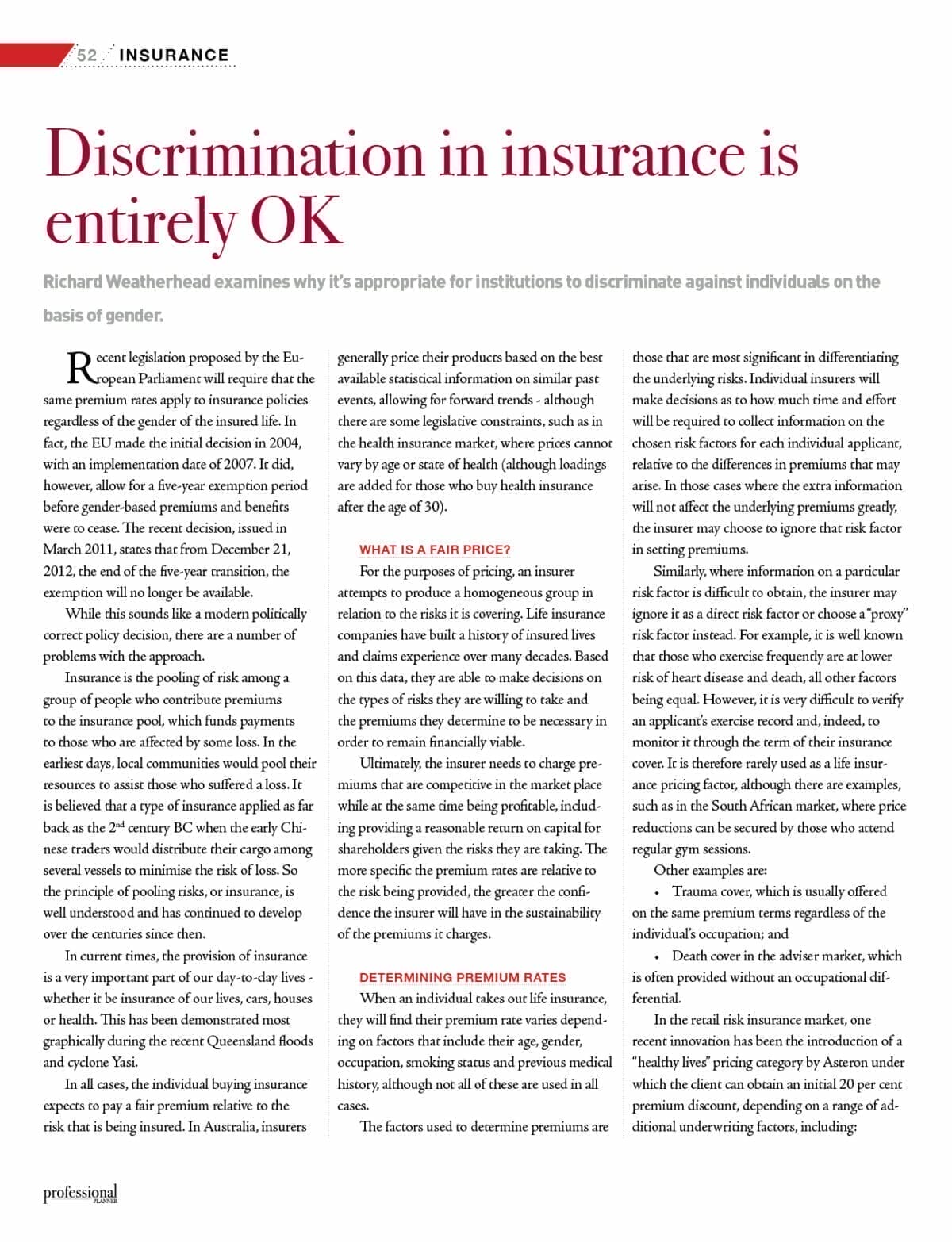 Recent legislation proposed by the European Parliament will require that the same premium rates apply to insurance policies regardless of the gender of the insured life. In fact, the EU made the initial decision in 2004, with an implementation date of 2007. It did, however, allow for a five-year exemption period before gender-based premiums and benefits were to cease. The recent decision, issued in March 2011, states that from December 21, 2012, the end of the five-year transition, the exemption will no longer be available.