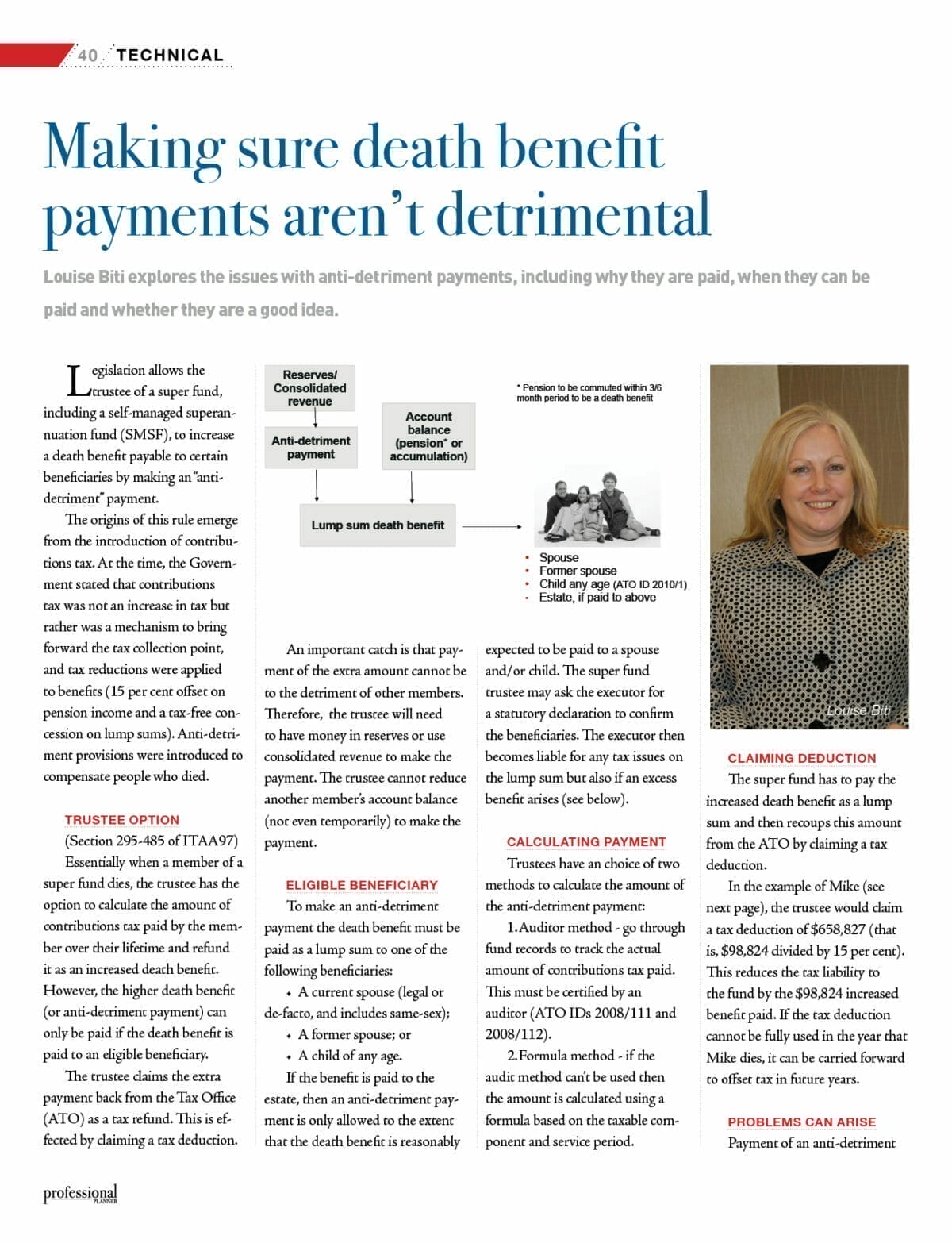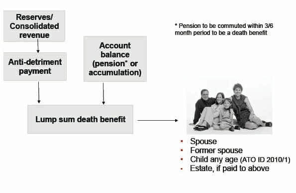 The ATO view (expressed in the National Tax Liaison Group meeting in March 2010) is that the anti-detriment amount is added to the member’s account before being paid as a death benefit.