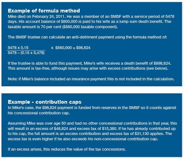 If the formula method is used, then the higher the taxable component in the death benefit, the higher is the potential anti-detriment payment. Therefore, if a member uses a cashout/recontribution strategy to increase the tax-free proportion, this may also reduce the anti-detriment payment.
