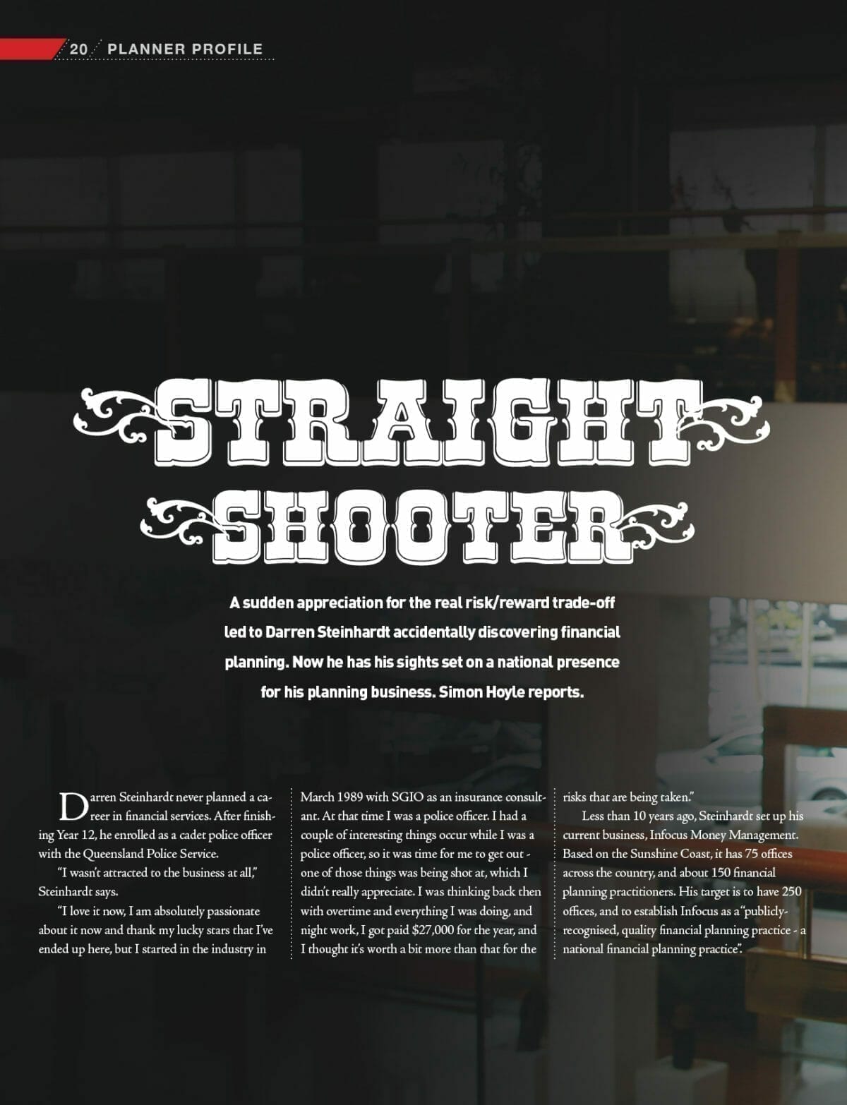 Less than 10 years ago, Steinhardt set up his current business, Infocus Money Management. Based on the Sunshine Coast, it has 75 offices across the country, and about 150 financial planning practitioners. His target is to have 250 offices, and to establish Infocus as a “publicly-recognised, quality financial planning practice – a national financial planning practice”.
