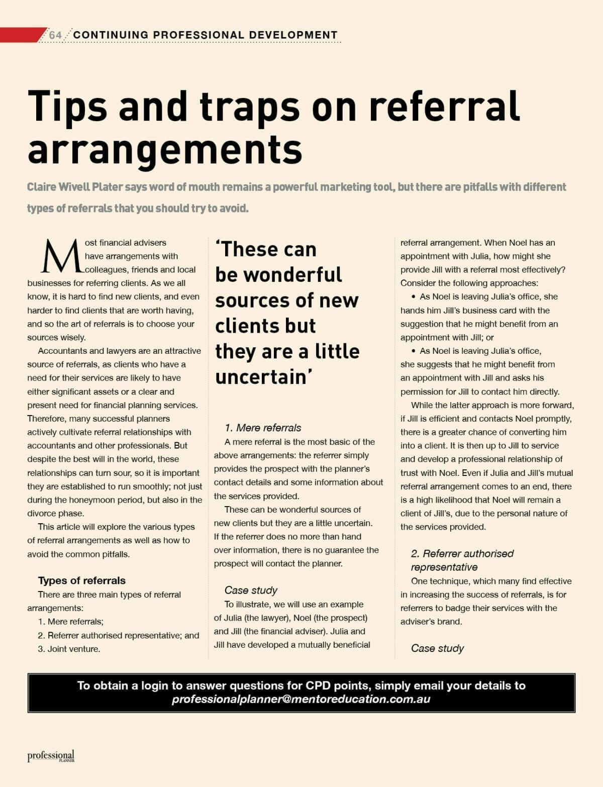 Most financial advisers have arrangements with colleagues, friends and local businesses for referring clients. As we all know, it is hard to find new clients, and even harder to find clients that are worth having, and so the art of referrals is to choose your sources wisely.