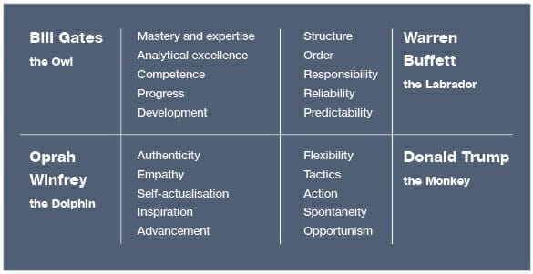 The table above shows four different values hierarchies, which align to 2500 years of research into deep-seated differences in values. We have taken the liberty of relating these four values hierarchies to four reasonably famous people – Bill Gates, Warren Buffett, Oprah Winfrey and Donald Trump.