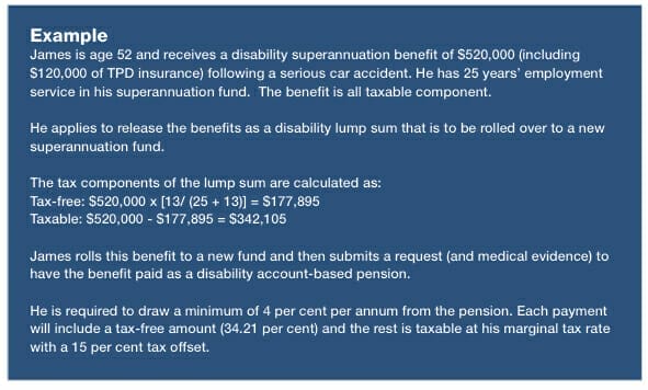 Benefits paid as a lump sum can include the calculation of a tax-free disability benefit representing the future service portion of the payment. A disability income stream will be eligible for a 15 per cent tax offset.