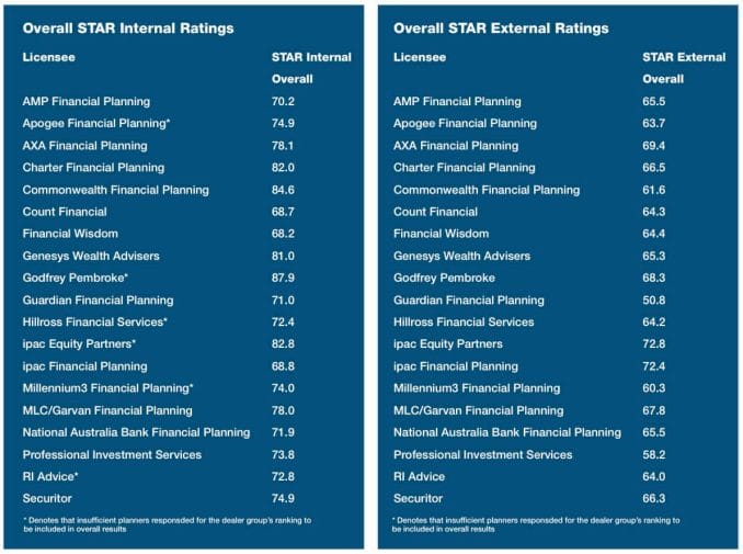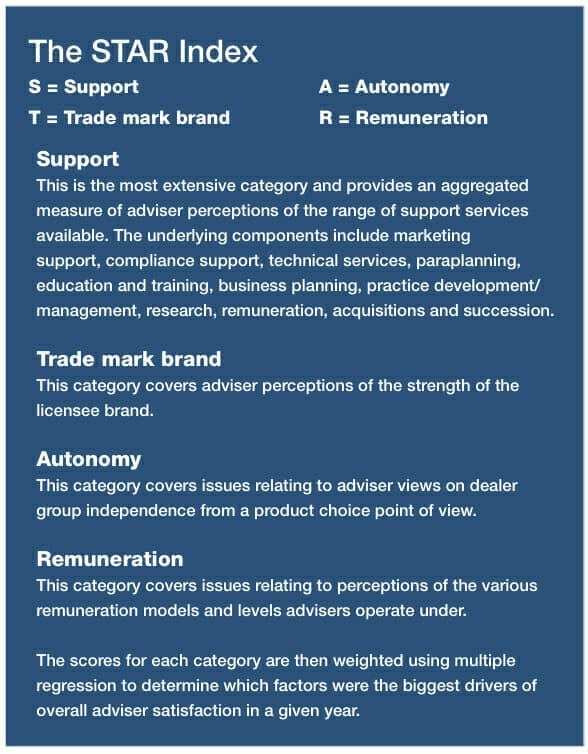 The research is based on an annual benchmark called the STAR Index, which measures adviser satisfaction with the support, trade mark brand, autonomy of product range and remuneration provided by their dealer group.