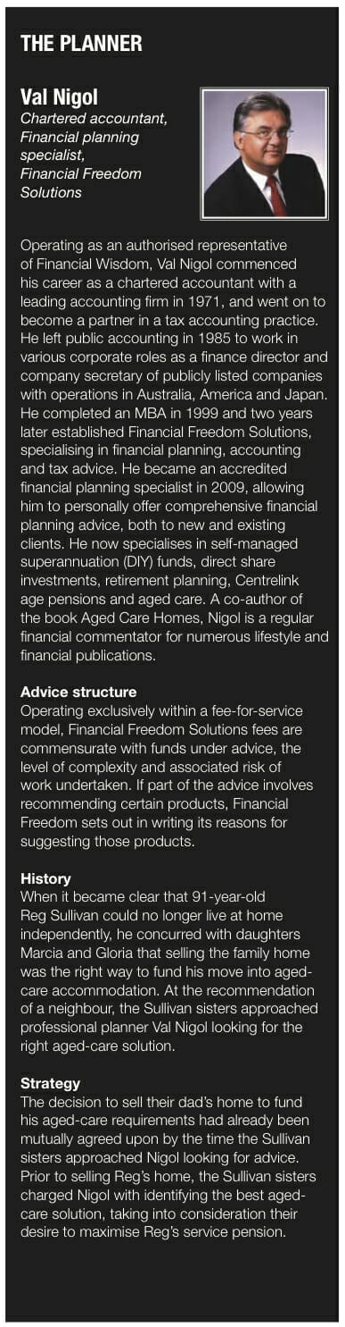 In some instances, where a couple is involved, he says one spouse may nominate their partner to continue to receive income payments from the annuity – but since Reg was alone, this wasn’t appropriate. In addition to sharing what’s left of Reg’s annuity when he dies, Nigol says it was important for the Sullivan daughters to understand that the balance of any unused accommodation bond – after deduction of a monthly retention – would be paid back to his estate. Based on DHA regulations, the maximum retention amount that can be deducted from Reg’s accommodation bond is $18,450 over five years, or $307.50 per month.
