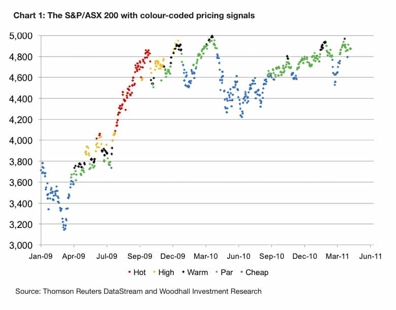 The first month or so of the recovery took the market into “green”, or fair-priced. A quick burst of black, yellow and then red coincided with a slight correction around June 2009. This was the normal behaviour before the GFC. After a dip in the index below 3800 and a cheap market (buying opportunity), the late 2009 bull run set off.