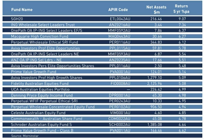 The table shows the latest performance data conducted by Morningstar, current to 30 June, with figures for large-cap domestic share funds ranked by their five-year rate of return. Interestingly, the best performers over five years weren’t necessarily those with the largest net assets.