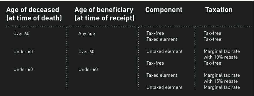 Where the benefits are taken as a pension, the taxation treatment depends on the age of the deceased and the beneficiary and the Taxable Components (TCs) of the pension payments, as shown in Table 1.