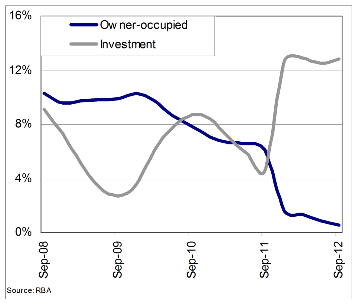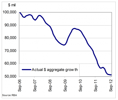 Australia’s mortgage market grew at just 4.2 per cent in the year to September 2012, in part due to the reclassification of billions of dollars of residential lending by Commonwealth Bank (CBA) and National Australia Bank (NAB) as business debt.