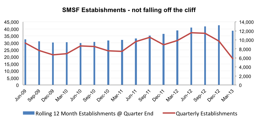 At first sight, the recent SMSF March quarter data released by the Australian Tax Office (ATO) showing a sharp 40-per-cent drop in SMSF establishments appears to indicate growth in the sector may not only be slowing but may actually be on the decline. However, any such alarms are, I think, unfounded.