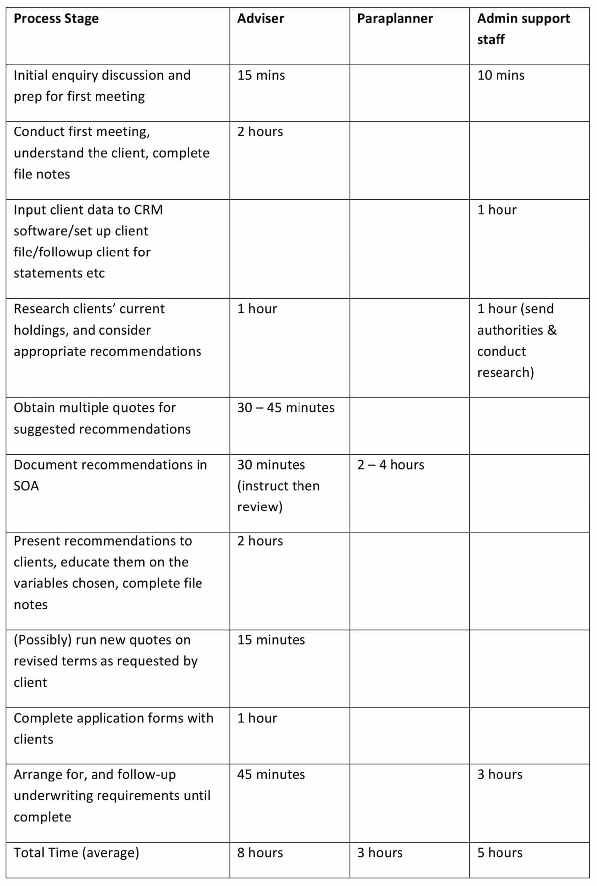 The model indicates a business will likely need to recover at least $3,430. This assumes the practice has access to a paraplanner and administrative support staff, with average charge-out rates of $299 for advisers, $171 for paraplannners and $105 for support staff. These figures are estimates from an Elixir study of adviser pricing models.