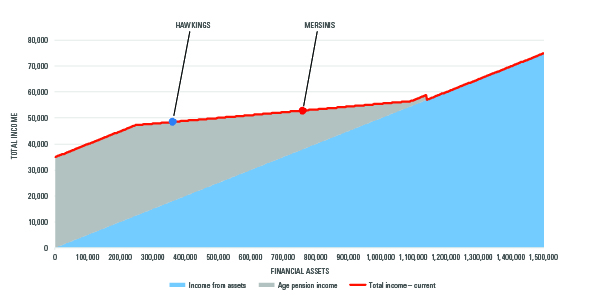 As the graph, left (click to enlarge), shows, if the investments of both couples earn 5 per cent per annum (pa) then, under current rules, the Hawkings will get $30,500 age pension bringing their total income to $48,500. The Mersinis will get a $14,900 pension and their total income would be $52,900. So long as the investments return more than 3.9 per cent pa (the current taper rate), the Mersinis will have more total income than the Hawkings.