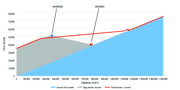 As the graph, left (click to enlarge), shows, if the 2015 Budget proposals are implemented, the Hawkings’ total income will be $51,000, slightly improved as the increase in the asset test free area would effectively increase their age pension. The Mersinis’ total income would be $39,900. While the Mersinis’ extra $400,000 investment is earning a respectable 5 per cent pa, they are losing the age pension at the rate of 7.8 per cent pa for every extra dollar they have invested. So, for every extra $100,000 invested, they are losing $2,800 in overall income.