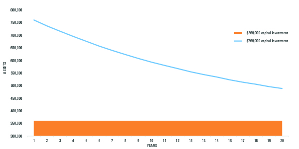 Another approach is for the Mersinis to draw from their investment capital to supplement any shortfall in income arising if the proposals are legislated, assuming the investment is flexible enough to allow this. The graph, left (click to enlarge), shows the impact of the Mersinis drawing capital to top-up cash flow to match the Hawkings’ total income in a 2 per cent pa earning environment, assuming that the Hawkings don’t deplete their $360,000 investment capital, using only investment income and age pension for lifestyle spending. After 10 years their investment capital has depleted to $567,379 and after 20 years it stands at $474,097.
