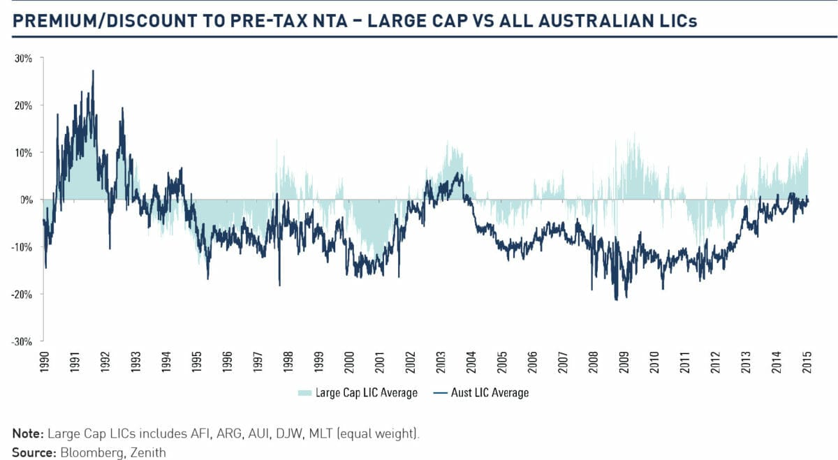 Although signals have been generally bullish, year-on-year positive movements in the premium/discount numbers across the sector appear to be losing momentum. In the periods 2012-2013 and 2013-2014, 77 per cent and 75 per cent of all equities LICs respectively (by number) experienced either a narrowing of discounts, or increases in their premium to pre-tax NTA. Calendar 2014-2015, however, saw this figure fall to 51 per cent of LICs experiencing positive movements.