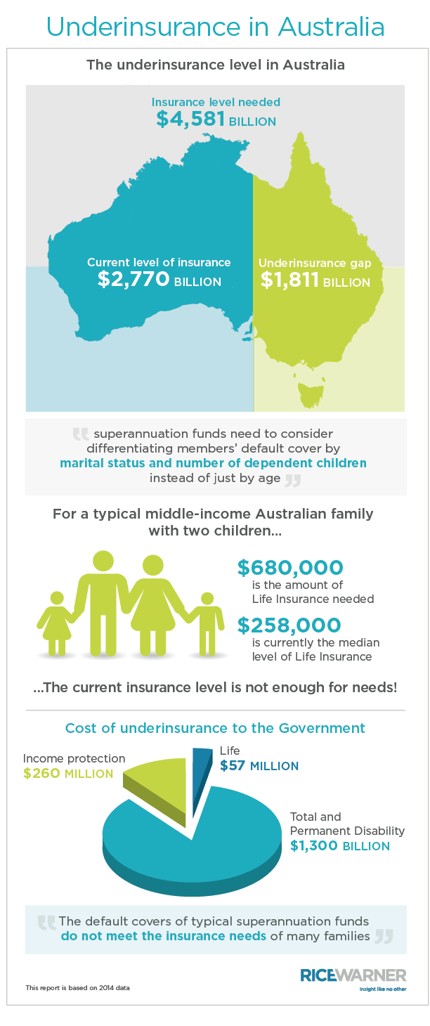 This report contains our estimate of the amount of underinsurance in Australia for the main life insurance coverages, namely life, total and permanent disability (TPD) and income protection benefits, as at 30 June 2014. Our report evaluates the estimated amount of insurance cover needed by varying consumer demographics and compares this with the amount of insurance actually held in each segment. The difference between these amounts is the Life underinsurance gap.